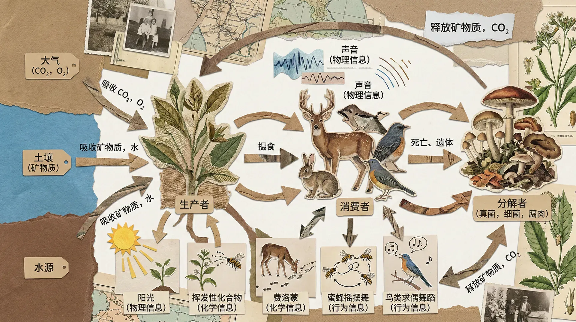 当我们观察一片森林时,会发现树木年复一年地生长,落叶不断堆积又逐渐消失,动物们在林间活动、繁衍生息。这一切生命活动都需要物质基础。组成生物体的碳、氮、磷、硫等化学元素从哪里来,又到哪里去呢?答案就在于生态系统的物质循环。