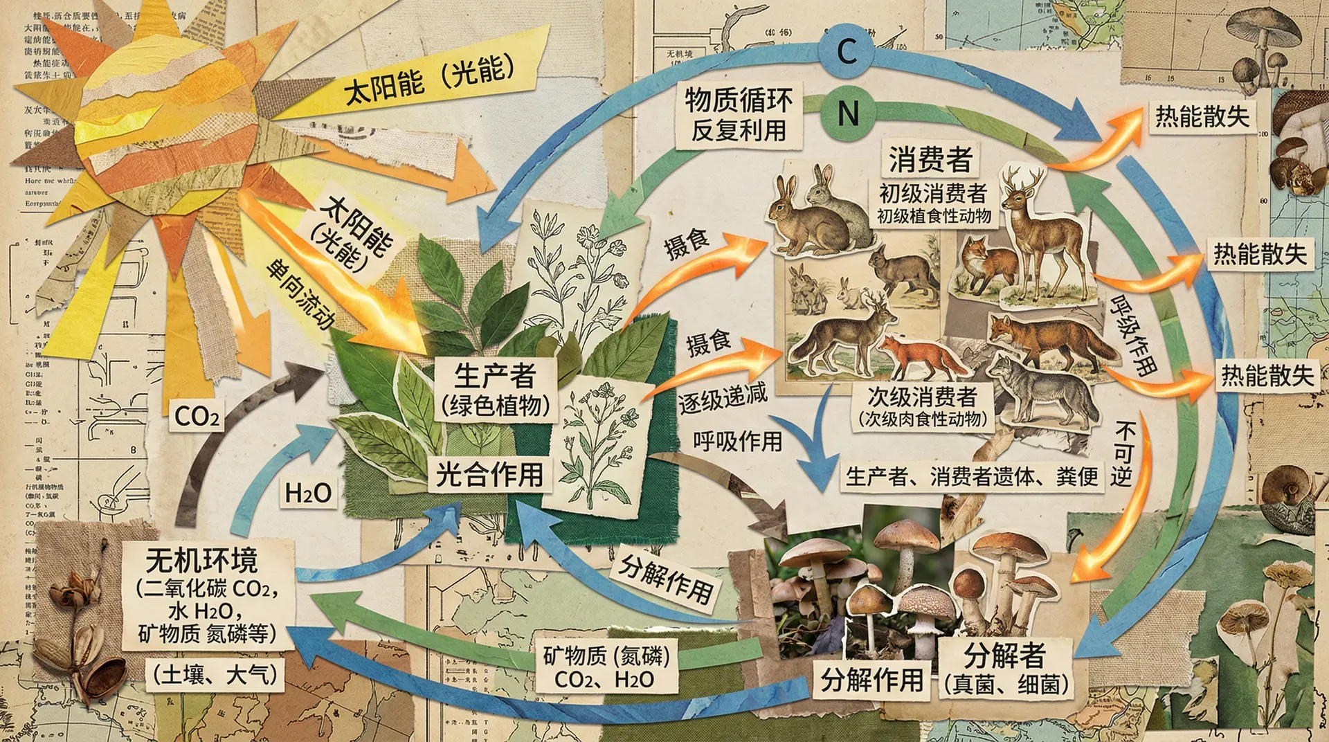 能量流动是单向的,需要持续输入;物质循环是往复的,可以反复利用。两者相互依存,共同维持生态系统的结构和功能。