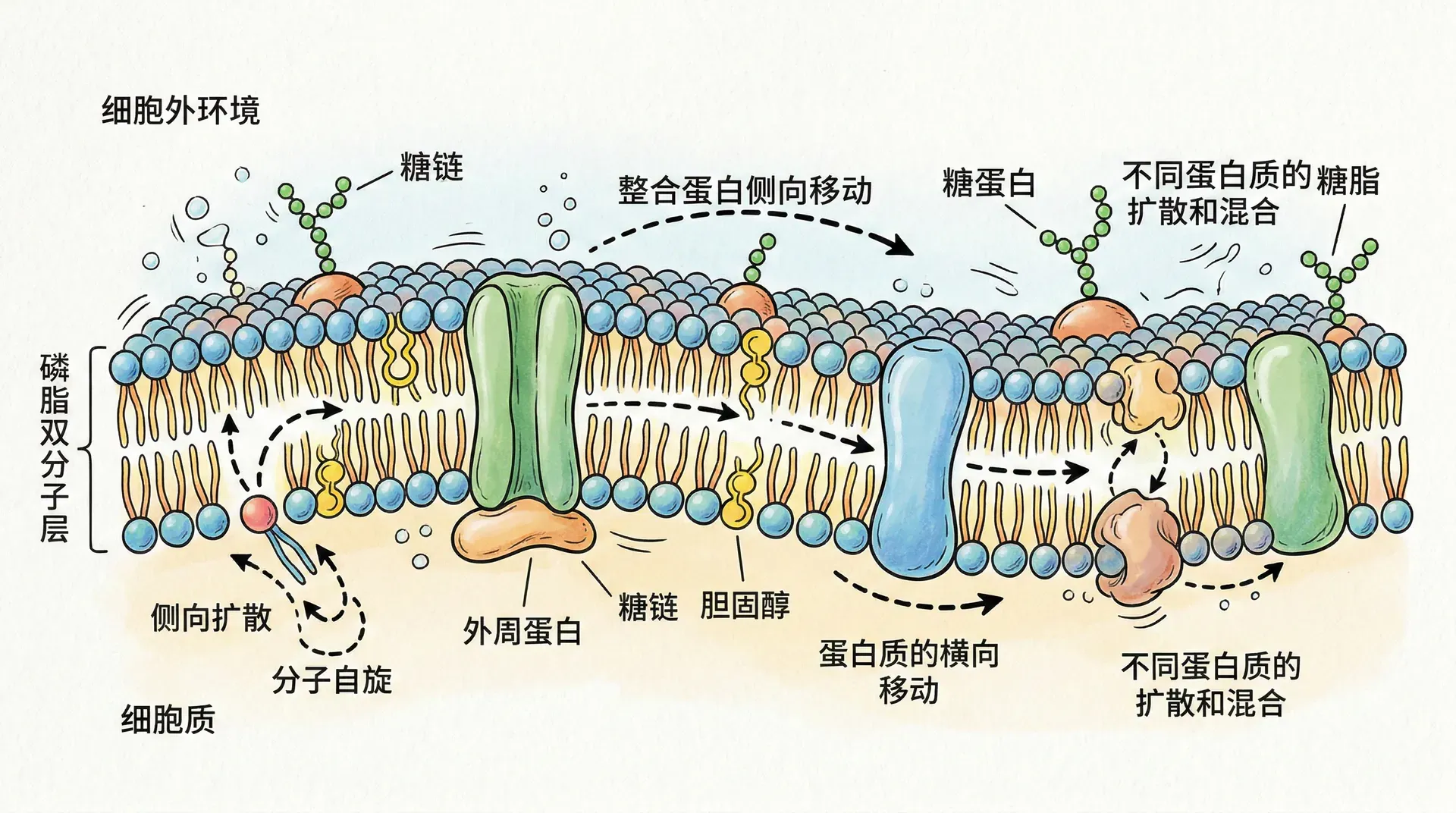 细胞膜不是一个静止的结构,而是处于持续的动态变化之中。脂质分子和蛋白质分子都可以在膜平面内自由移动,就像是在“二维液体”中游动。这种流动性对于细胞的许多功能至关重要。