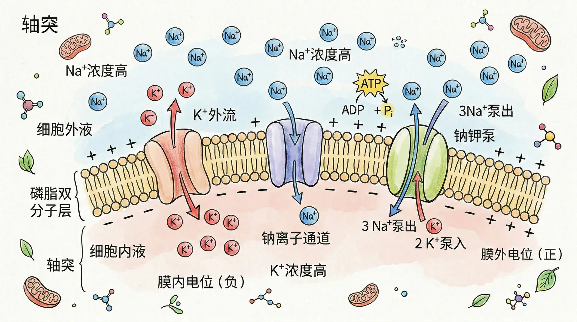 解析: 钠钾泵每工作一次,将3个Na⁺运出细胞,同时将2个K⁺泵入细胞,帮助维持细胞内低Na⁺、高K⁺的状态。