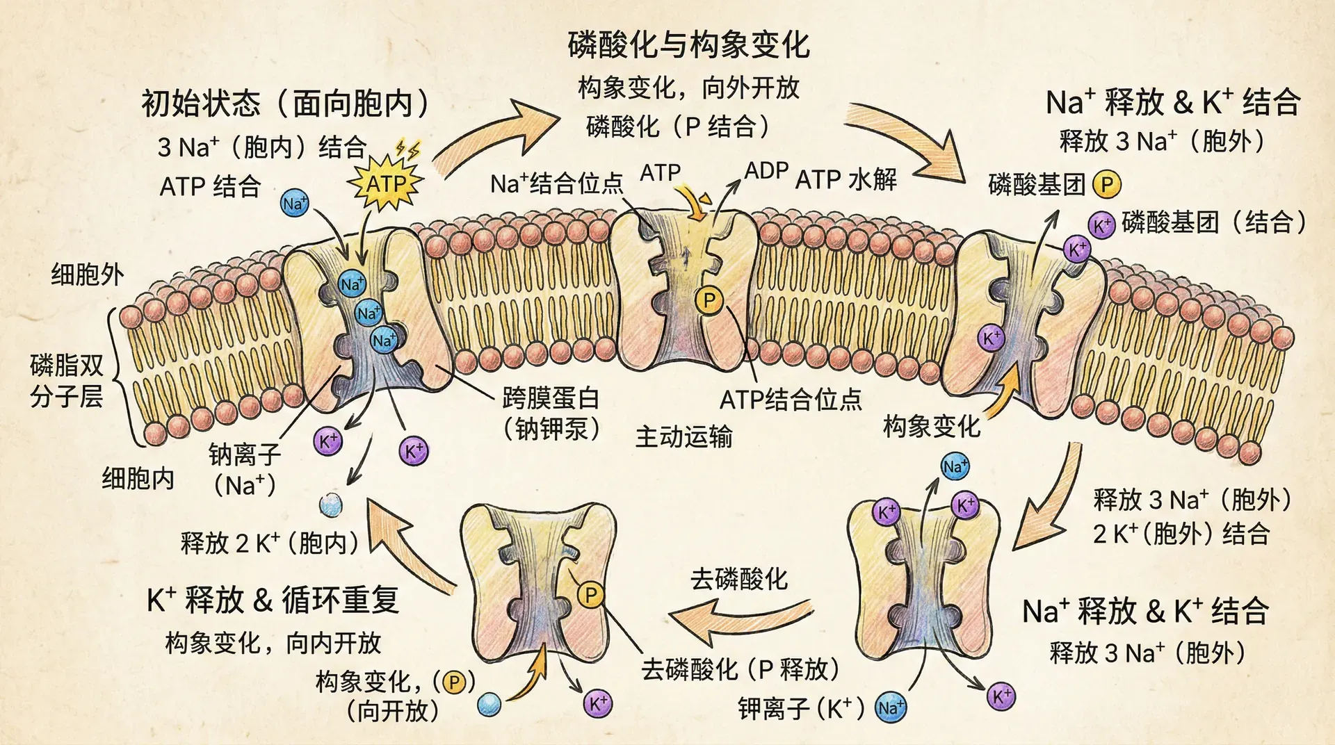 钠钾泵(Na⁺-K⁺-ATPase)是最重要的离子泵之一,广泛存在于动物细胞膜上。这个泵每次工作将3个钠离子从细胞内泵出,同时将2个钾离子从细胞外泵入,消耗1个ATP分子。