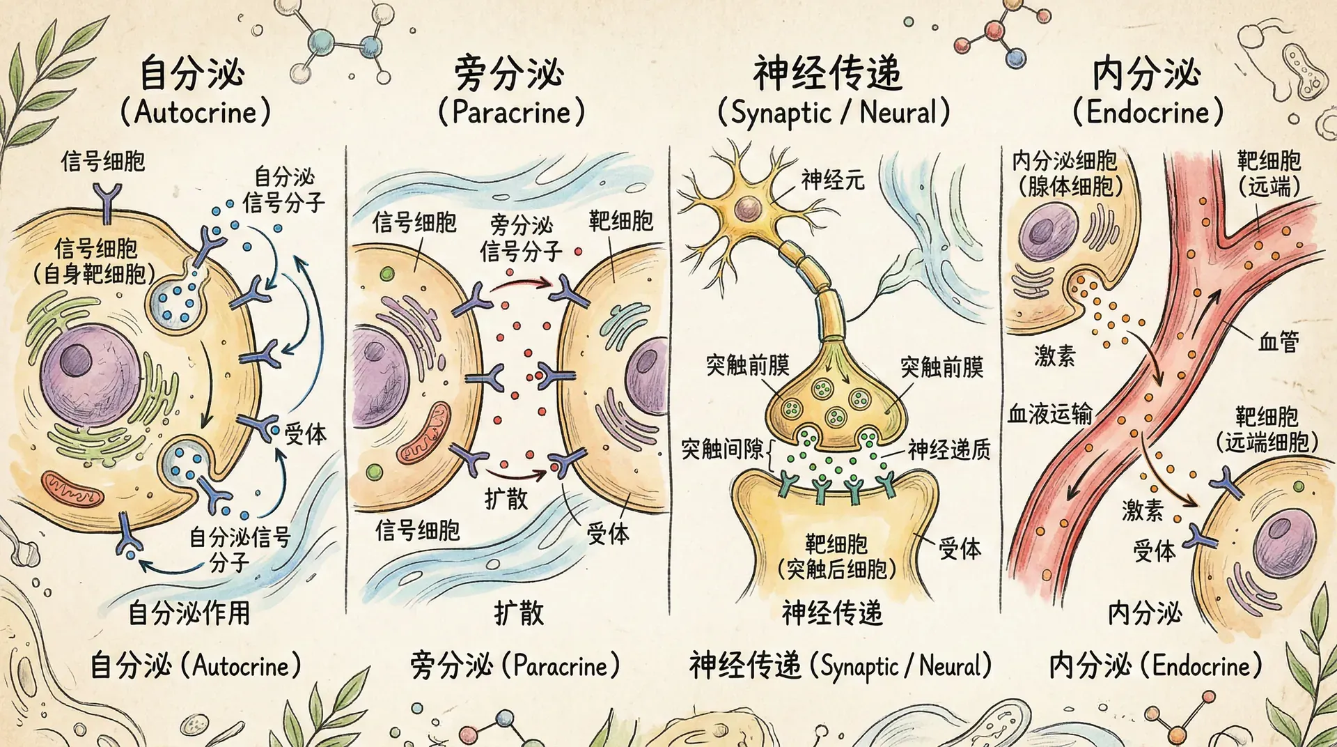 内分泌是远距离信号传递的主要方式。内分泌细胞将激素分泌到血液中,激素随血液循环到达全身各处,作用于具有相应受体的靶细胞。这种方式的作用范围广泛,但相对较慢,信号通常需要几秒到几分钟甚至更长时间才能到达靶细胞。