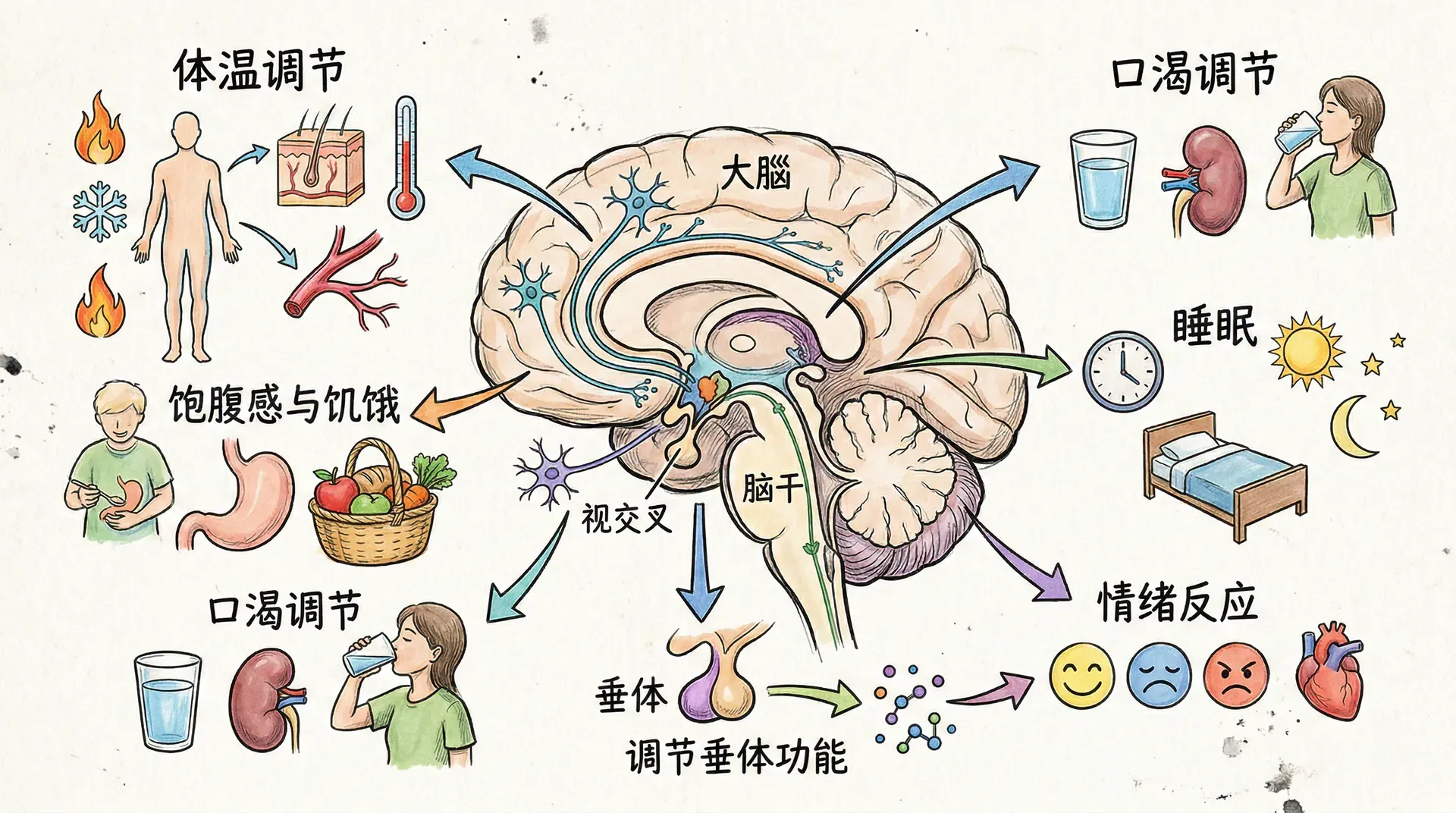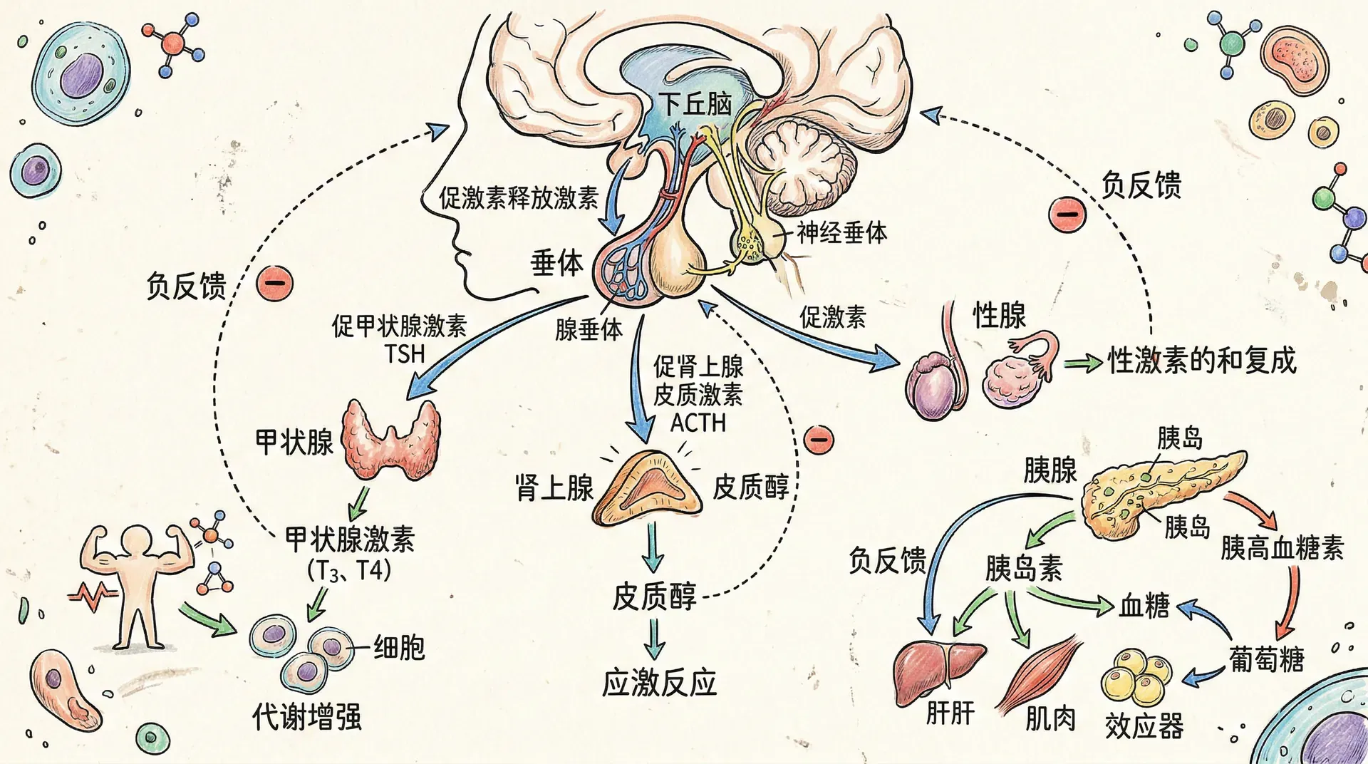 内分泌系统不是孤立运作的,它与神经系统、免疫系统构成神经-内分泌-免疫调节网络,共同维持机体稳态。这个网络的核心是下丘脑,它既接收来自大脑皮层、边缘系统的神经输入,也感知血液中各种激素和代谢产物的变化,整合这些信息后发出调控指令。