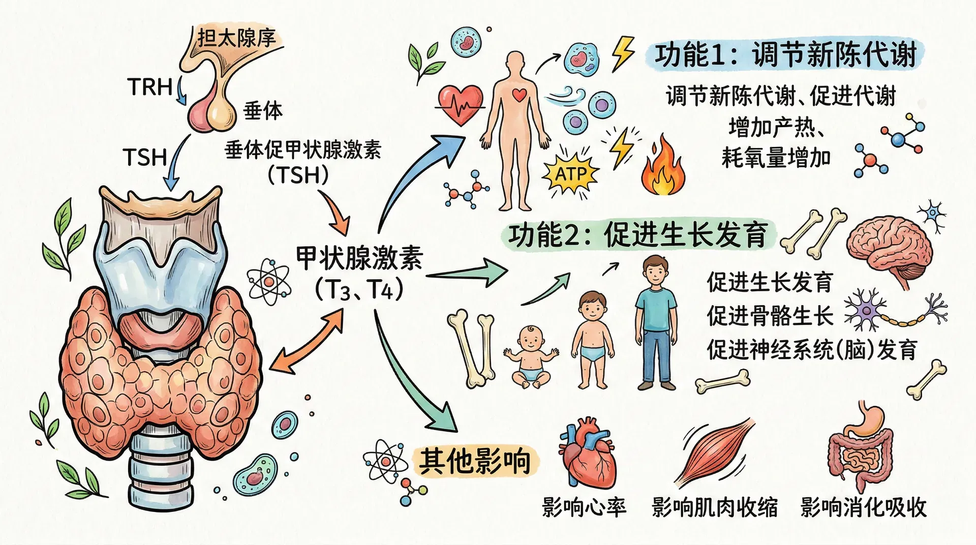 甲状腺激素对全身代谢有广泛影响。它能促进细胞内氧化代谢,增加产热,因此冬天时甲状腺激素分泌会增多,帮助维持体温。它还能促进蛋白质、脂肪和碳水化合物的代谢,影响生长发育。在胎儿和婴幼儿时期,甲状腺激素对大脑和骨骼的发育尤为重要,缺乏会导致克汀病,表现为智力低下和身材矮小。