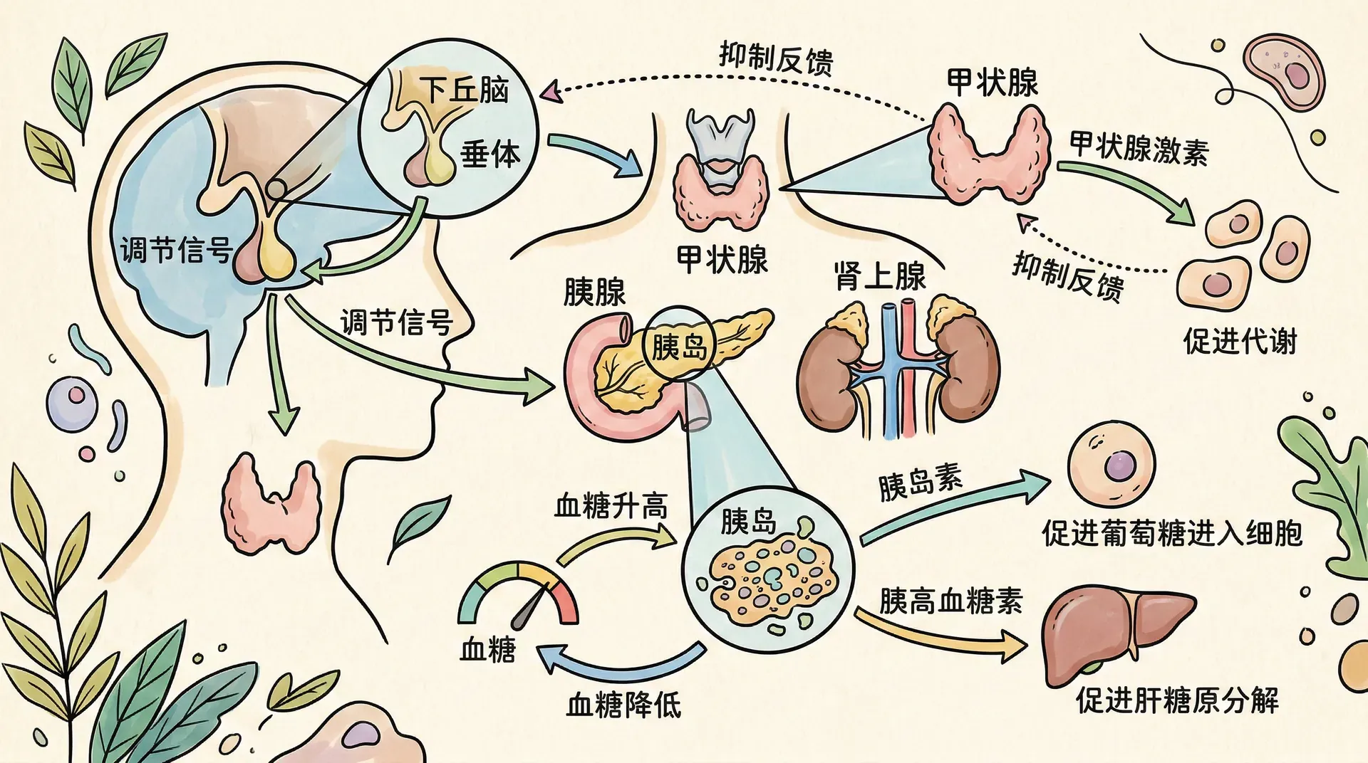 拮抗作用:如胰岛素降低血糖,而胰高血糖素、肾上腺素、皮质醇提升血糖,二者动态平衡决定血糖浓度。