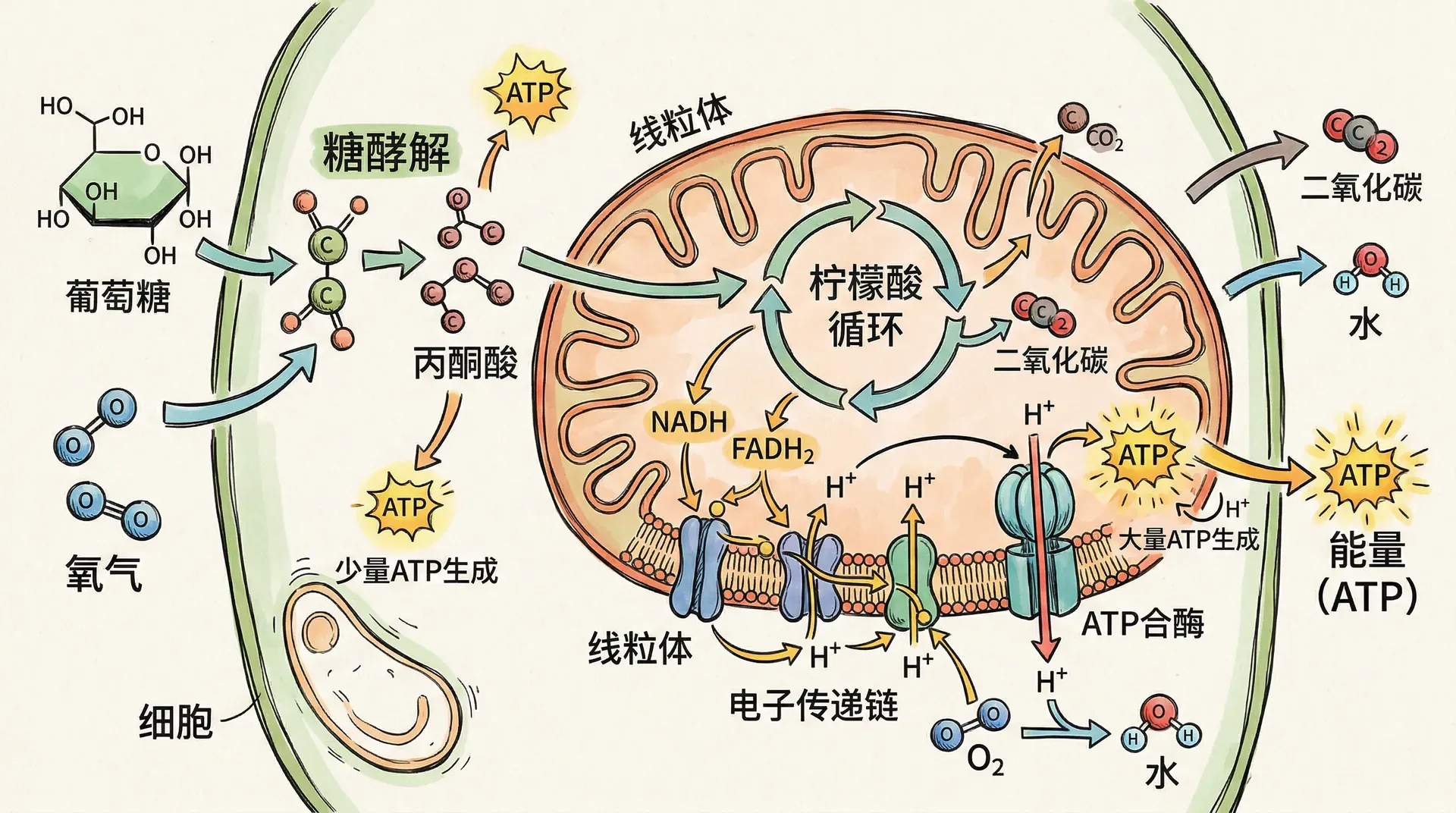 有氧呼吸主要在线粒体中进行,分为三个阶段:糖酵解、柠檬酸循环(三羧酸循环)和电子传递链。下面用表格简要梳理各阶段主要特点: