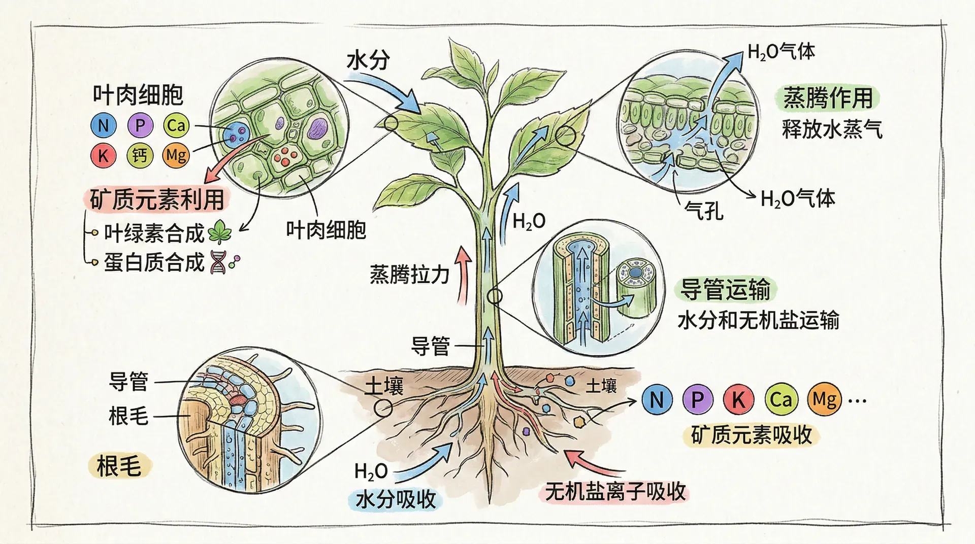 植物的正常生长发育需要多种矿质元素。这些矿质元素可以分为大量元素和微量元素。大量元素包括氮(N)、磷(P)、钾(K)、钙(Ca)、镁(Mg)、硫(S)等,植物需求量较大;微量元素包括铁(Fe)、锰(Mn)、铜(Cu)、锌(Zn)、硼(B)、钼(Mo)、氯(Cl)等,植物需求量虽少,但同样不可缺少。