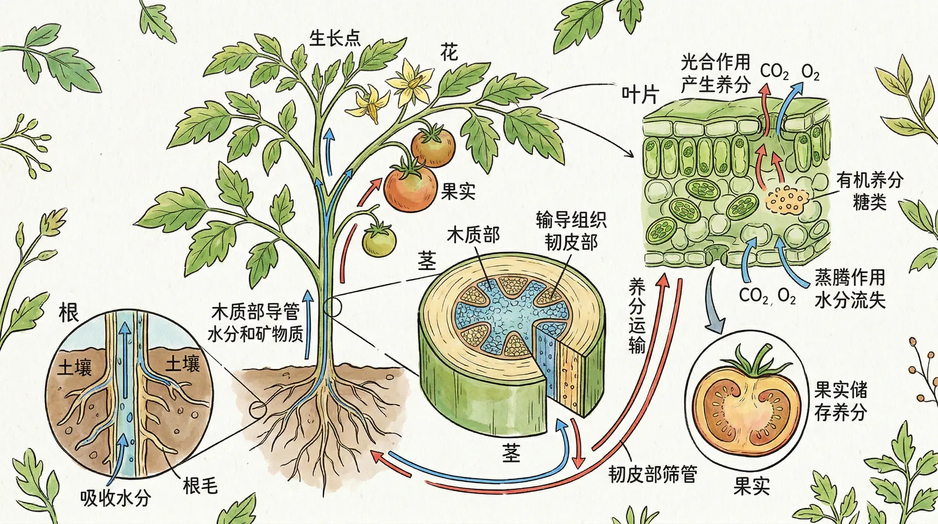 植物体内物质主要依赖维管束系统完成运输。维管束由木质部和韧皮部组成——木质部负责水分和矿质元素的自下而上的单向运输,韧皮部则主要输送有机物,并可双向流动。