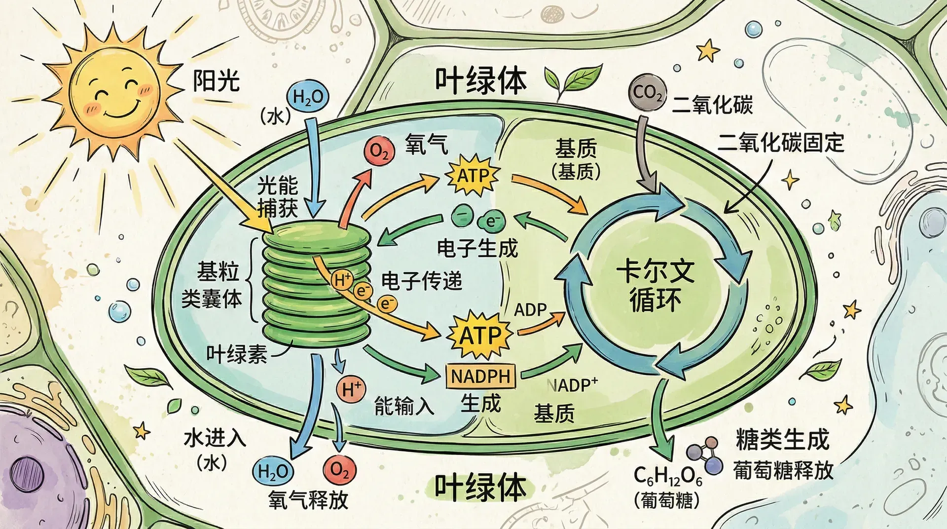 暗反应在叶绿体的基质中进行,并不直接依赖光能,但必须借助光反应产生的和。其核心为卡尔文循环,分为三大阶段:固定、还原、五碳糖再生。