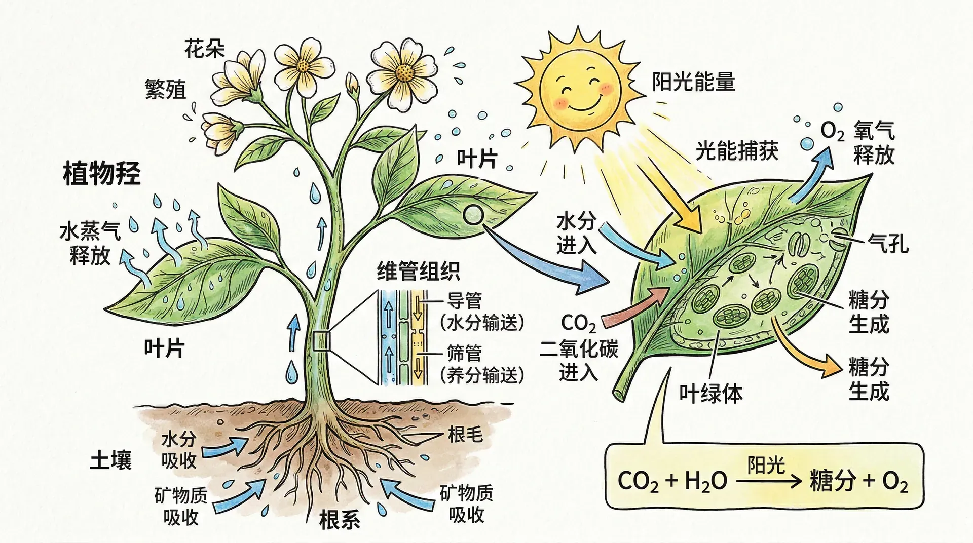 植物作为地球上最重要的生产者,通过光合作用固定太阳能,为生态系统中的其他生物提供能量和物质基础。在前面的内容中,我们详细学习了动物的各个生理系统,现在让我们把目光转向植物世界,探索植物如何在没有神经系统和循环系统的情况下,依然能够完成复杂的生命活动。