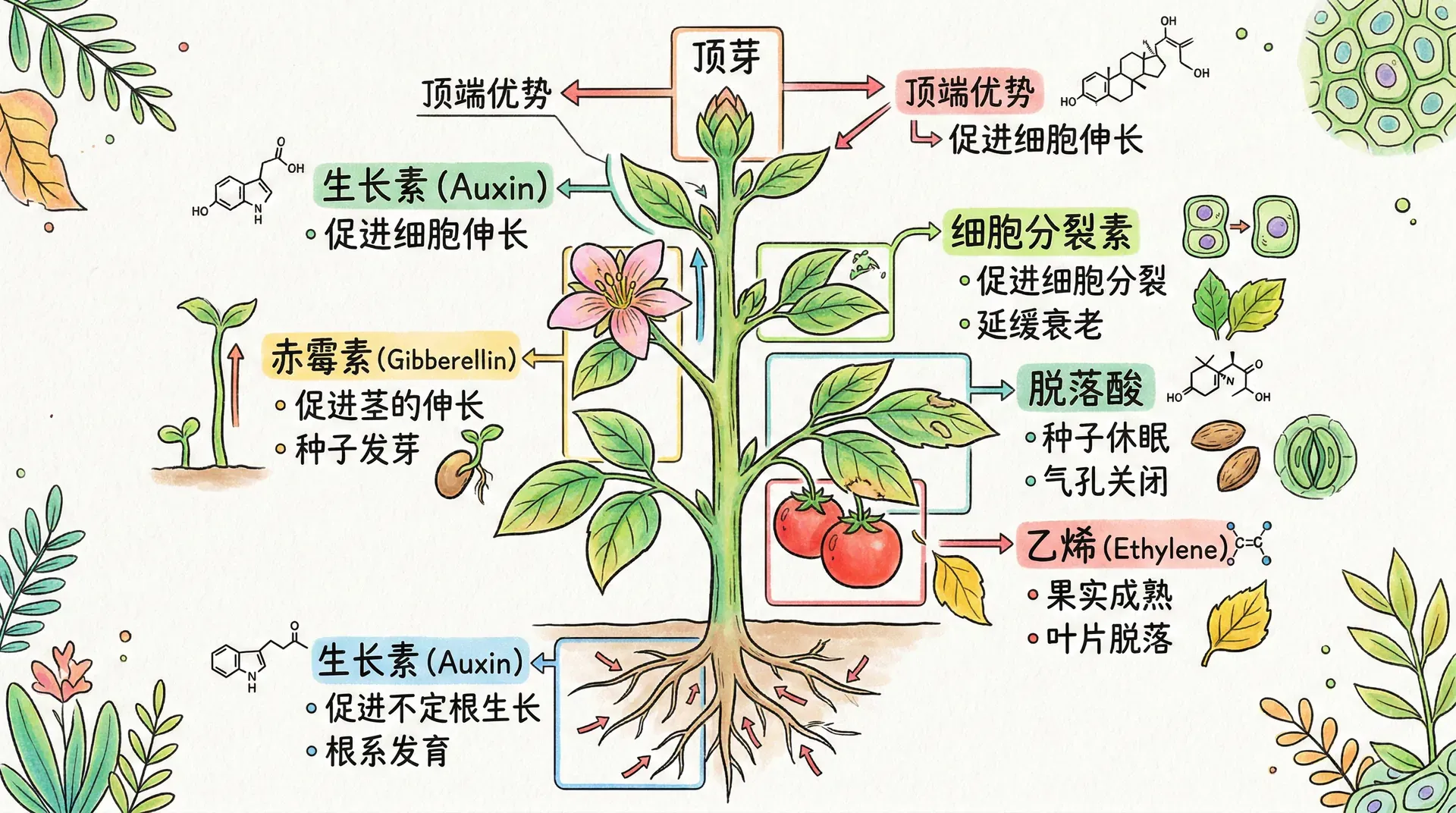 我们全面地了解了植物激素的基本种类、合成部位、运输方式以及它们在调控植物生长发育过程中的复杂作用机制。植物激素虽然在体内含量极低,但却能够通过精细的信号传递和分子调控,协调植物的生长、分化、开花、结果、休眠等一系列生命活动。