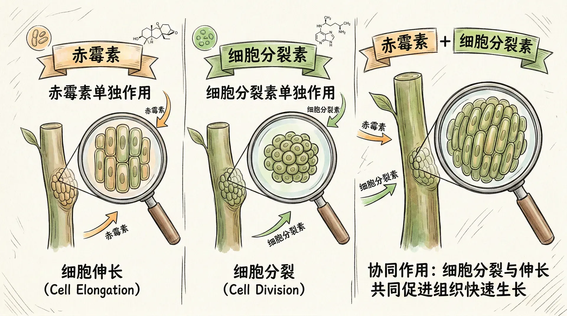 生长素、赤霉素和细胞分裂素这三种促进生长的激素在植物生长发育中往往协同作用。在细胞伸长过程中,生长素促进细胞壁松弛,赤霉素增强这一效应,而细胞分裂素则促进细胞分裂,为细胞伸长提供更多的细胞基础。