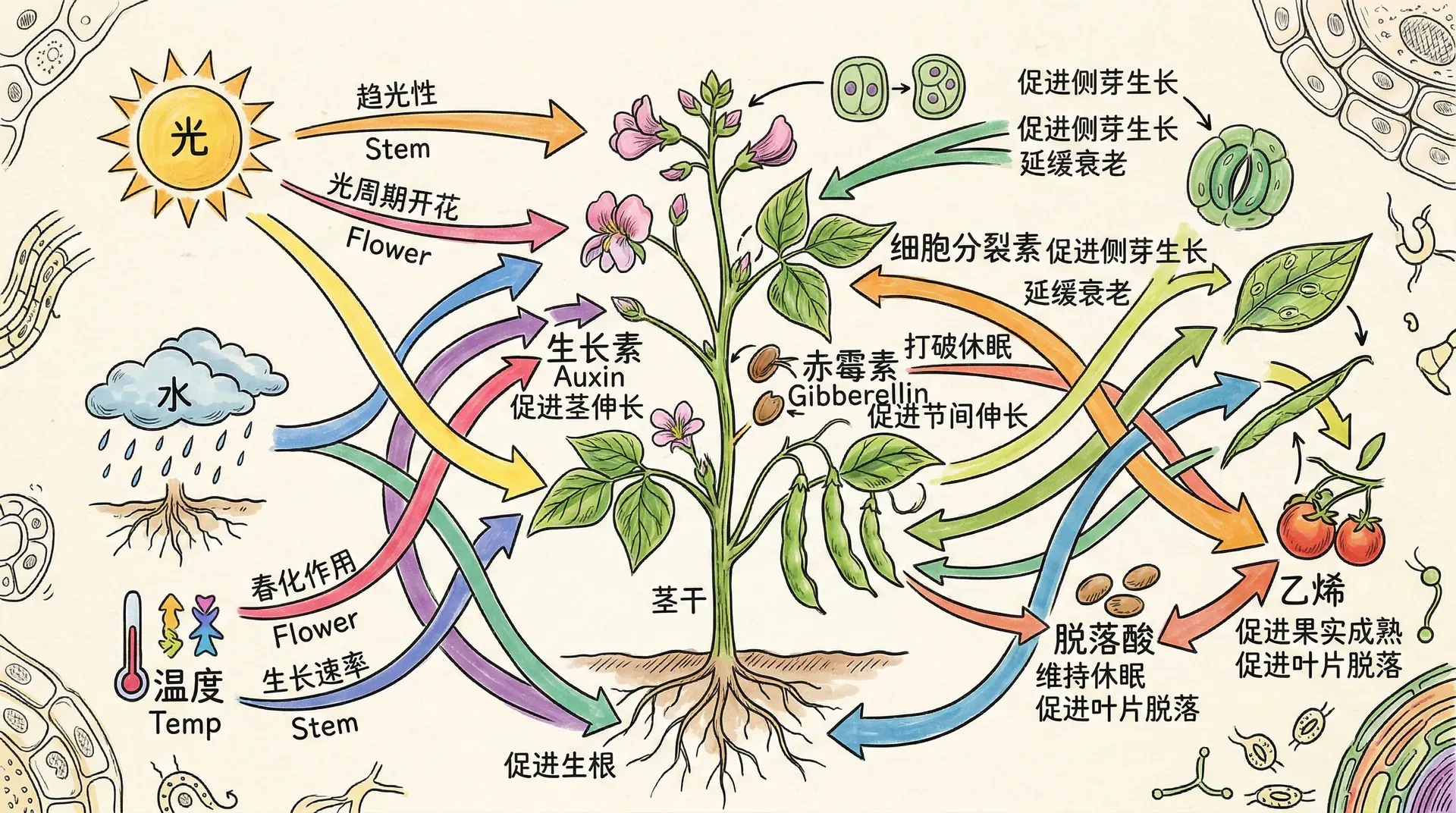 植物的生长发育调控依赖于多种激素与环境因子的共同作用。这些激素并不是孤立地发挥作用,而是在复杂的信号网络中相互影响、相互调控。例如,生长素、细胞分裂素、脱落酸、赤霉素、乙烯等激素之间可以通过影响对方的合成、运输和信号转导方式,形成多层次的调控环路。