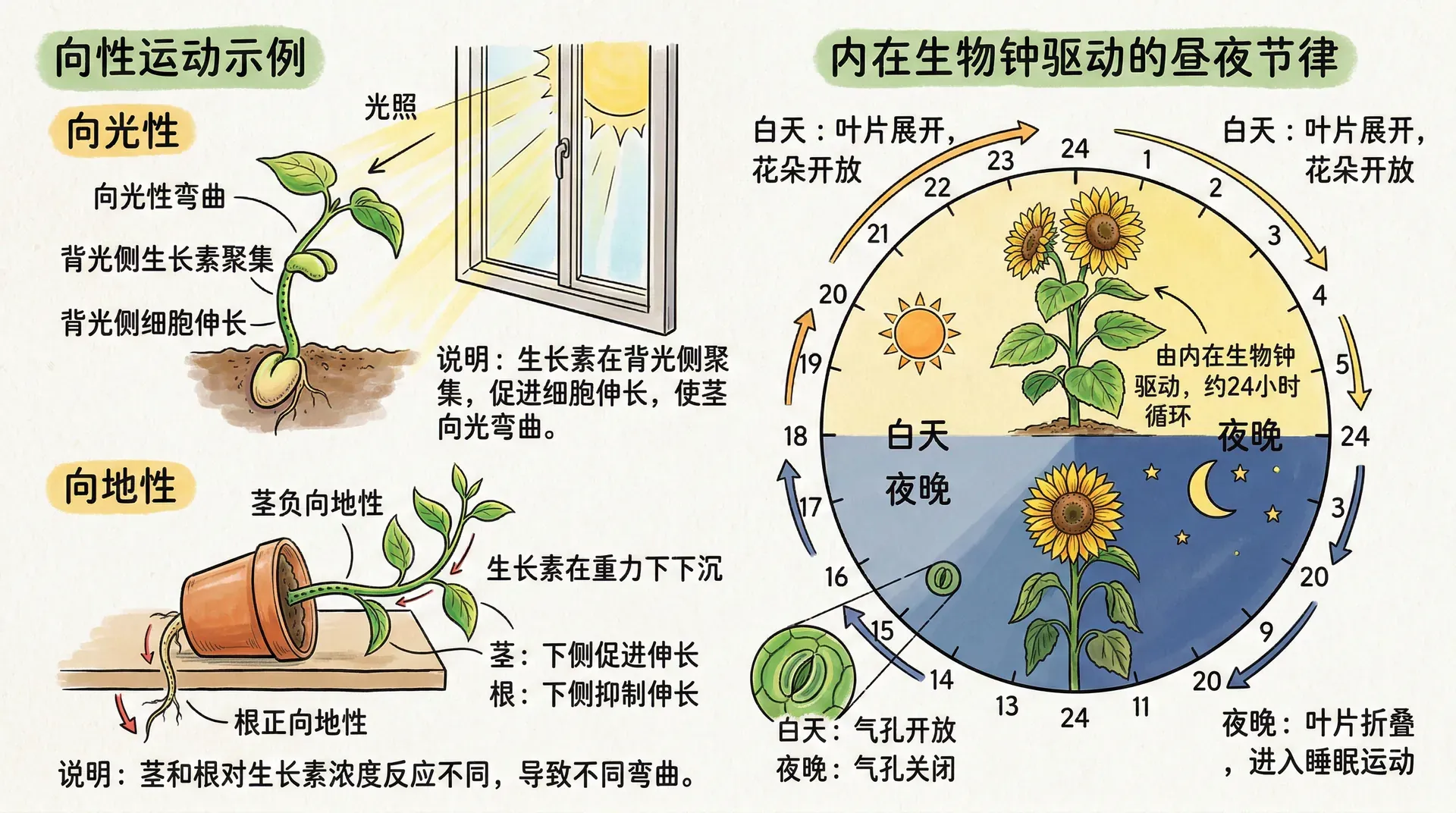 植物的向性运动是指植物器官针对外界刺激方向产生的定向生长反应,常见类型包括向光性、向重力性和向触性等,其中以向光性和向重力性最为典型。下面用简表对比展示这两种向性运动的基本机制与激素调控: