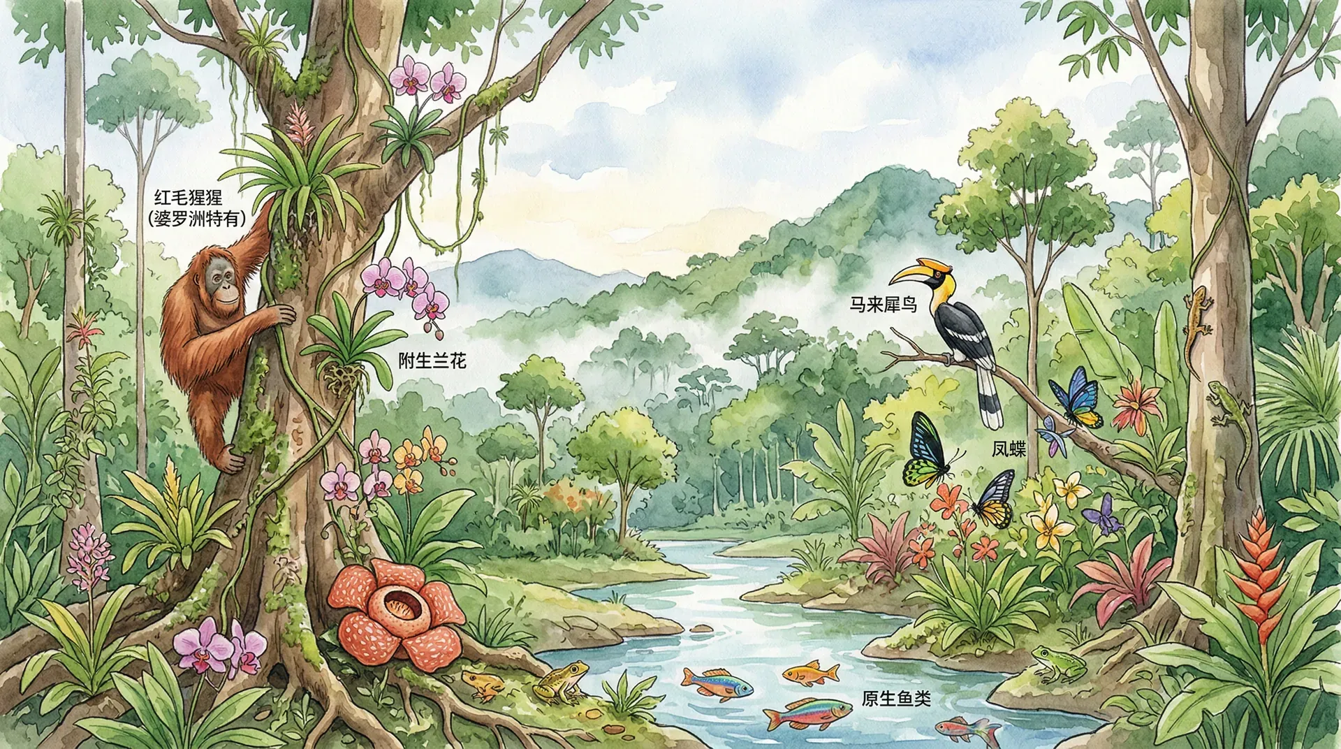这一模式在多个生物类群中都得到了验证。以鸟类为例,亚马逊雨林一个10平方公里的区域可能拥有超过300种鸟类,而整个阿拉斯加州的鸟类物种数也不过400多种。植物同样如此,热带雨林一公顷的土地上可能生长着数百种乔木,而北方针叶林中乔木种类往往不超过十种。