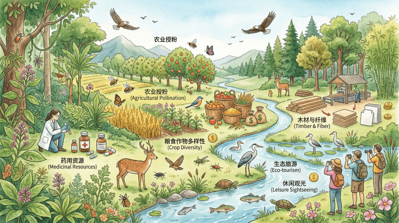 以“传粉服务”为例:全球约75%的粮食作物依赖动物传粉,昆虫(特别是蜜蜂、蝴蝶、甲虫等)是主要贡献者。近年来蜜蜂数量急剧减少——这被称为“蜜蜂危机”。导致蜜蜂减少的原因包括杀虫剂滥用、栖息地破坏与病原体威胁。下方展示了生物多样性对人类福祉的几项关键作用: