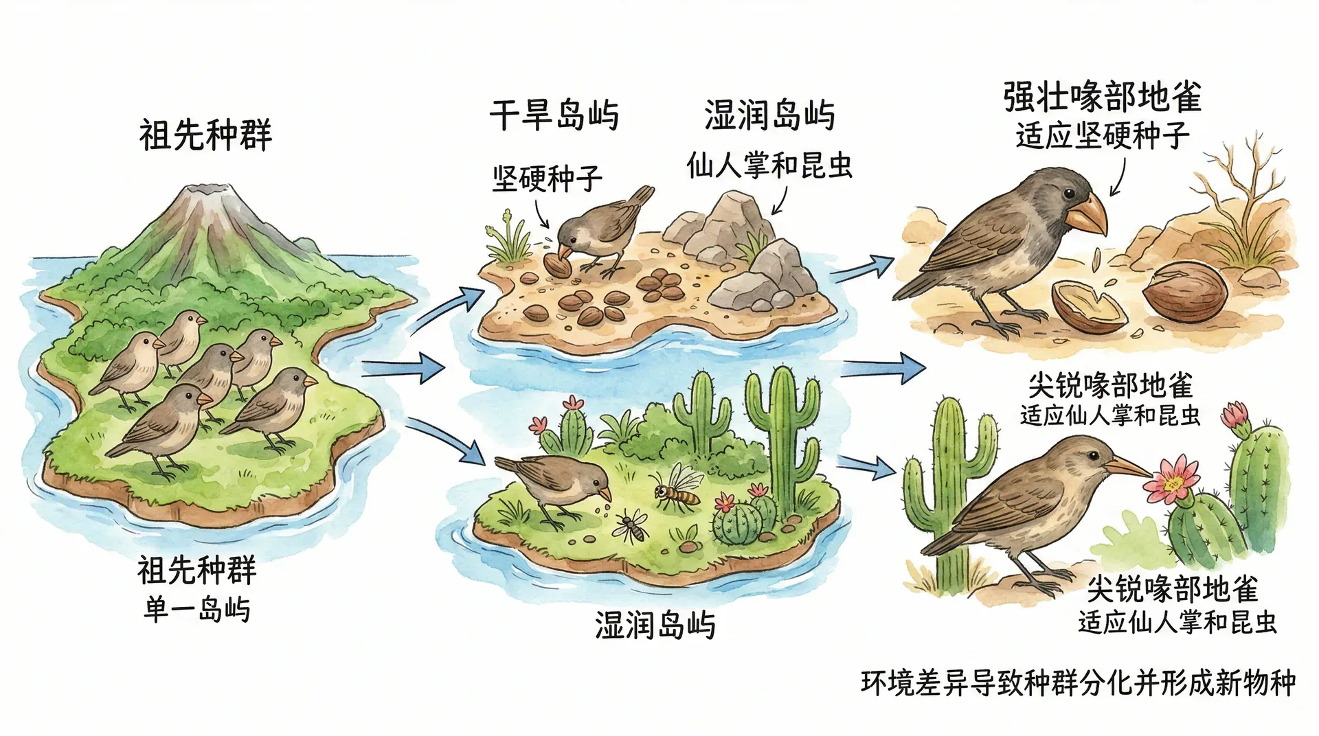 达尔文在加拉帕戈斯群岛上观察到的地雀,是物种形成的经典案例。这些地雀的祖先从南美大陆迁移到群岛上,在不同岛屿上面对不同的食物资源,经过长期的自然选择,演化出不同的喙型。有的地雀喙粗大,适合敲开坚硬的种子;有的地雀喙细长,适合捕捉昆虫;还有的地雀喙尖锐,甚至会用仙人掌刺取食树皮下的昆虫。