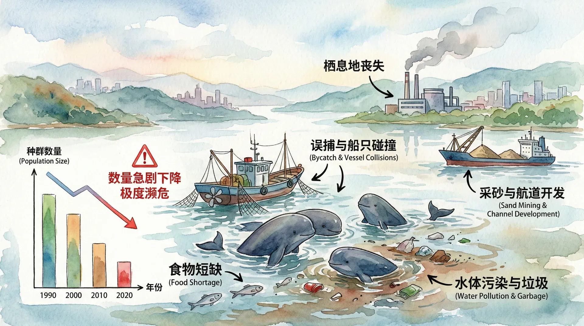 长江江豚是长江特有的淡水鲸类动物,被誉为长江生态系统健康的指示物种。然而,近几十年来,江豚种群数量持续下降,保护形势十分严峻。