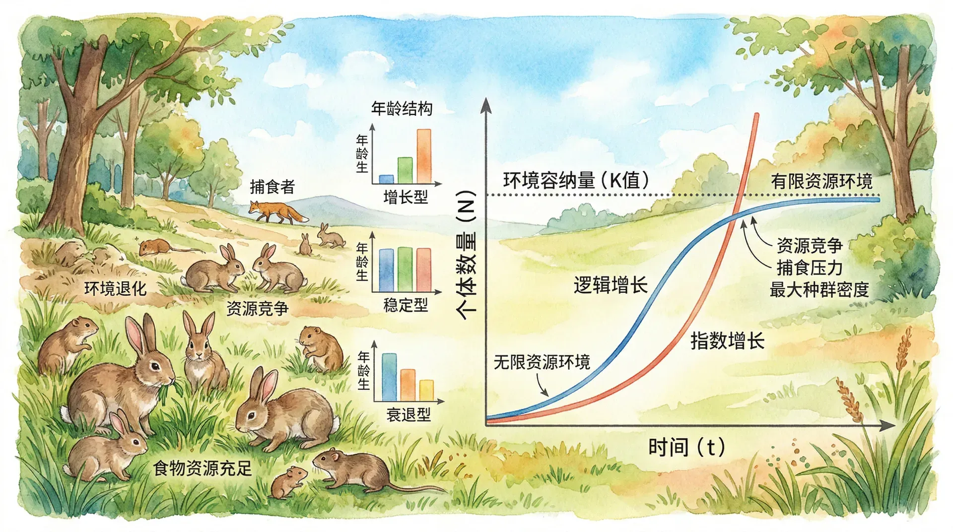 种群是生态学研究的基本单位之一,它指的是在一定时间和空间范围内,同一物种的所有个体组成的集合。要准确描述一个种群的状态,我们需要掌握几个核心参数。