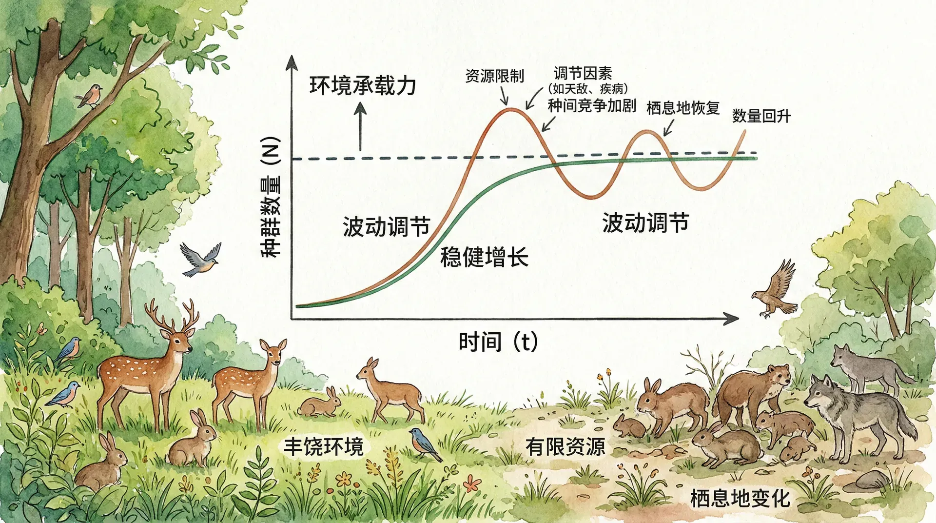 种群数量不会无限制地增长,自然界中存在多种调节机制来限制种群规模。这些调节机制可以分为密度制约因素和非密度制约因素两大类。