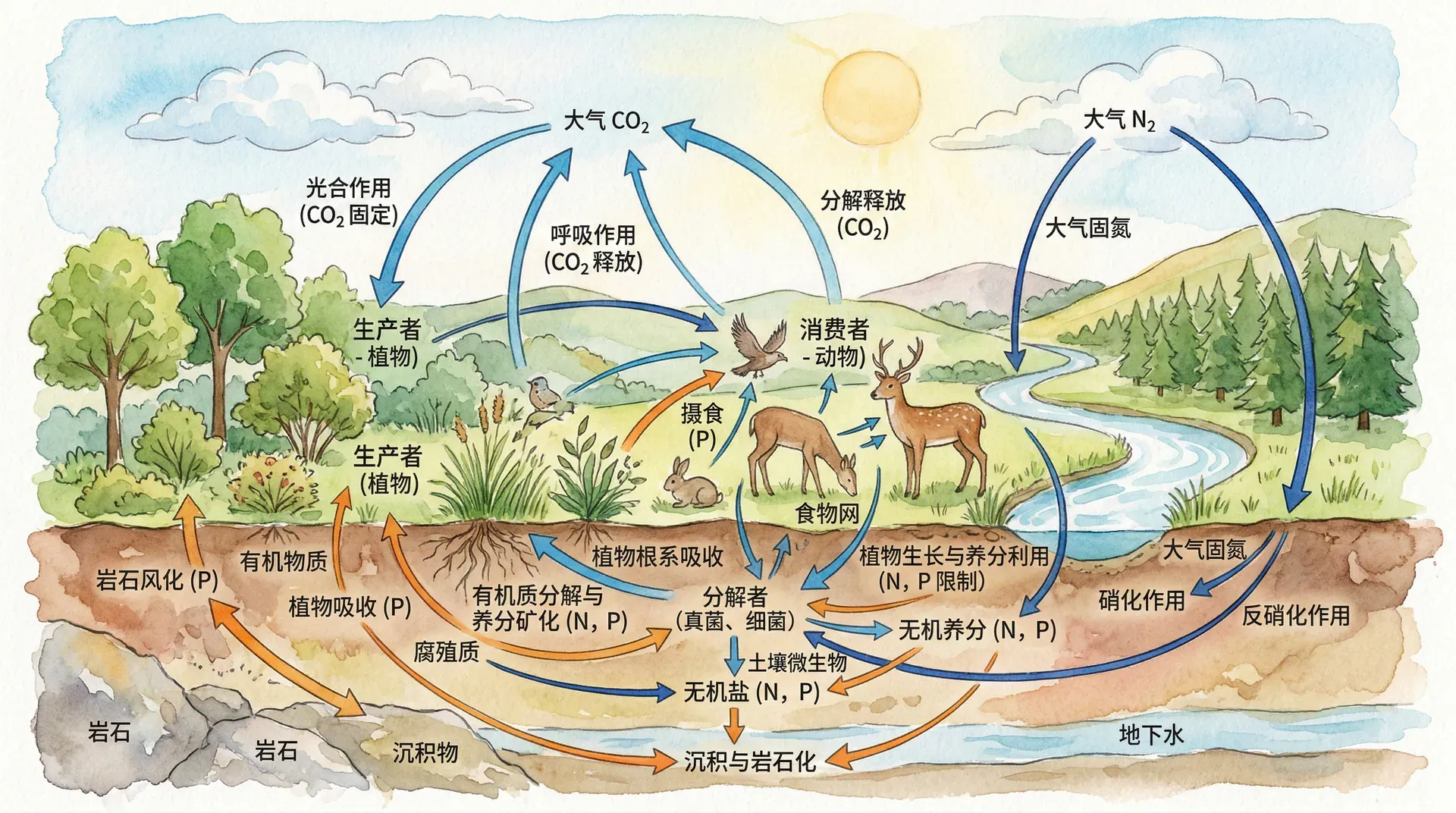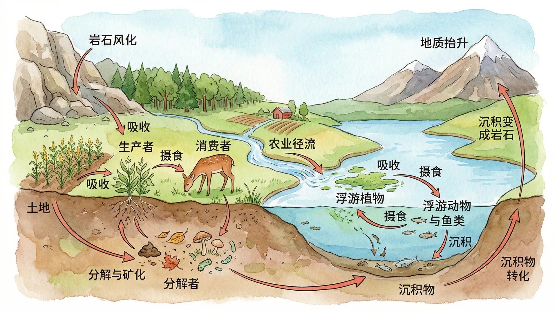 物质循环是维持生态系统功能的基础过程。碳循环通过光合作用和呼吸作用,连接着生物与大气;氮循环通过固氮、硝化、反硝化等过程,在各种形态之间转化;磷循环作为沉积型循环,主要在陆地和水体之间流动;水循环则作为纽带,将各种物质循环串联起来。