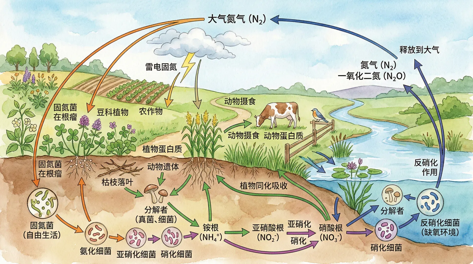 与硝化作用相反的是反硝化作用。在缺氧环境中,反硝化细菌会将硝酸盐还原为氮气,使氮重新回到大气中。这个过程主要发生在水淹土壤、湿地和水体底泥中。