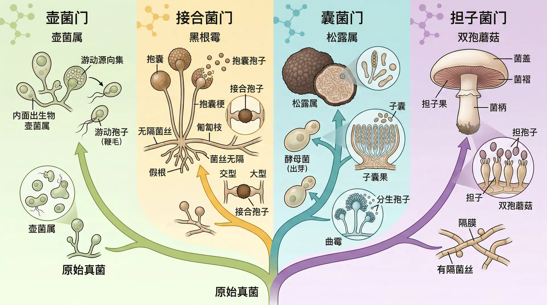 真菌界包含了大量物种,估计全球有150万至300万种真菌,但目前已被描述和命名的只有约12万种。真菌的分类主要基于其形态特征、生活史类型和分子生物学特征。