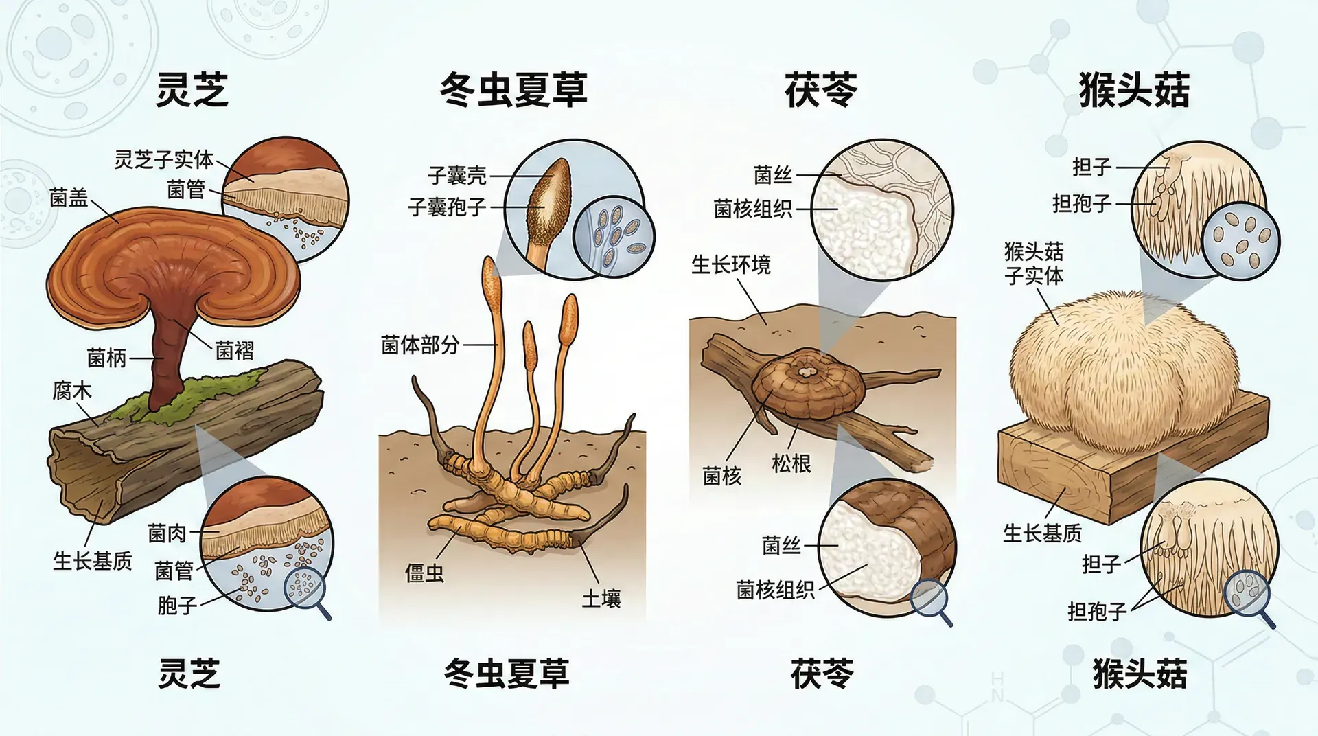 药用菌是中医药的重要组成部分。灵芝含有多糖和三萜类化合物,具有增强免疫、抗肿瘤和保肝的作用。冬虫夏草用于补肺益肾,现代研究证实其含有虫草素等活性成分。茯苓用于利水渗湿、健脾宁心。