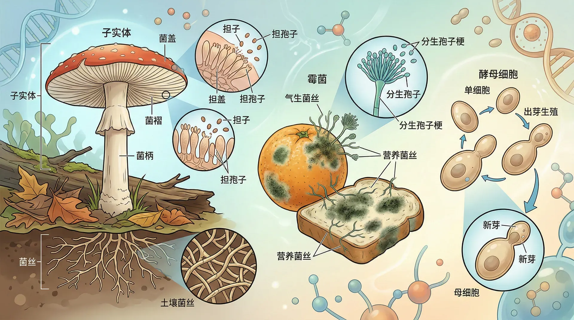 大型真菌(如蘑菇)的可见结构称为子实体,它只是菌丝体的繁殖部分。子实体通常分为菌盖、菌柄和菌褶(或菌管)三部分。菌褶或菌管表面大量分布着担子,担子上会形成和释放担孢子。以蘑菇为例,一个中等大小的子实体就能生成上亿个孢子,这些孢子借助风力等扩散到环境,遇到适宜条件后即可萌发新的菌丝体。