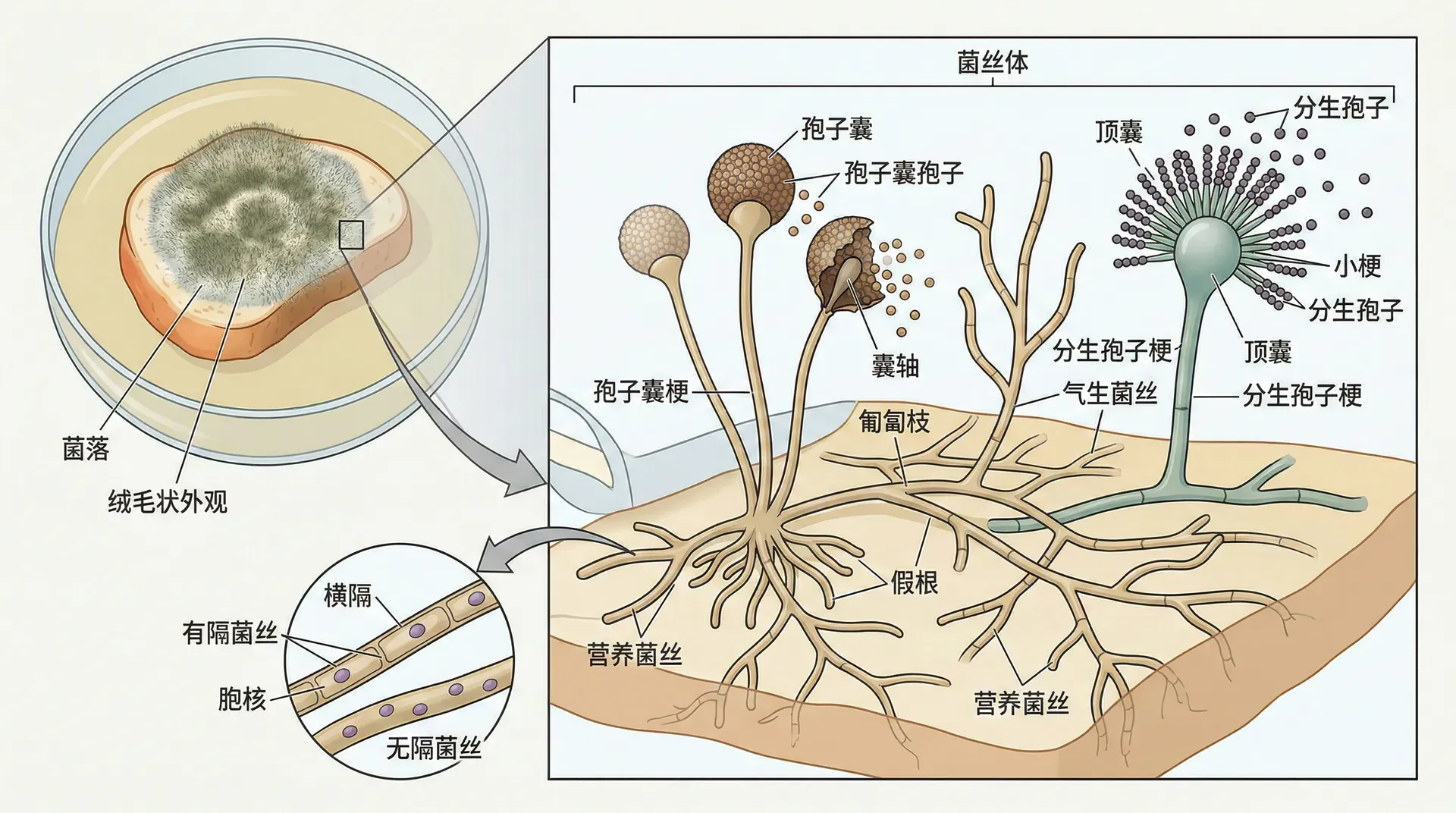 霉菌是多细胞真菌,菌落常呈绒毛状(例如变质馒头表面,蓝、黑、白色菌丝)。其基本结构为菌丝体,由无数菌丝交织而成。
