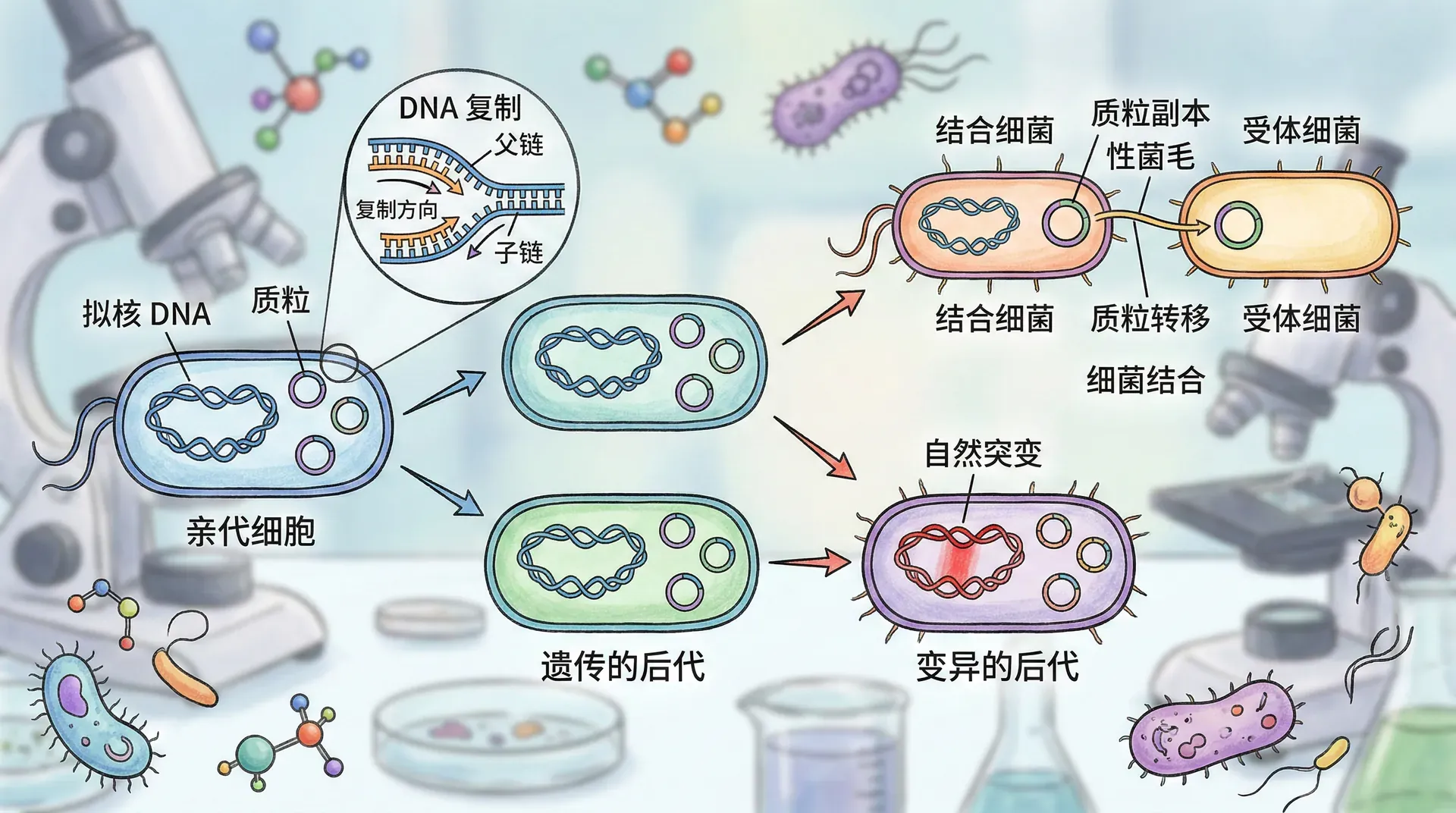 三种方式共同构成了细菌水平基因转移(HGT)的网络,使细菌能够快速获得新的遗传特性,适应环境变化,这也是细菌进化速度远超高等生物的重要原因。