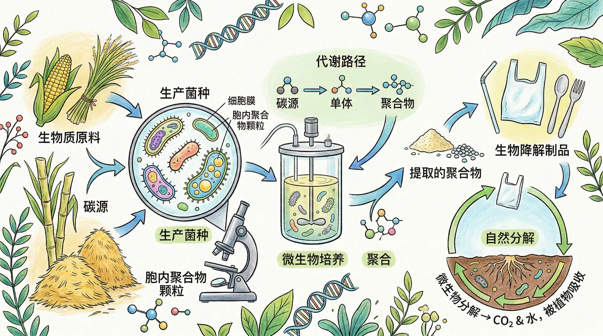 全球塑料污染催生了可降解塑料的市场需求。聚羟基脂肪酸酯(PHA)是常见的生物可降解塑料,由多种细菌(如贪铜菌、氮固定菌)在富碳环境下大量合成,含量可达细胞干重80%以上。PHA原料可制作袋膜、包装、生物医用等产品。