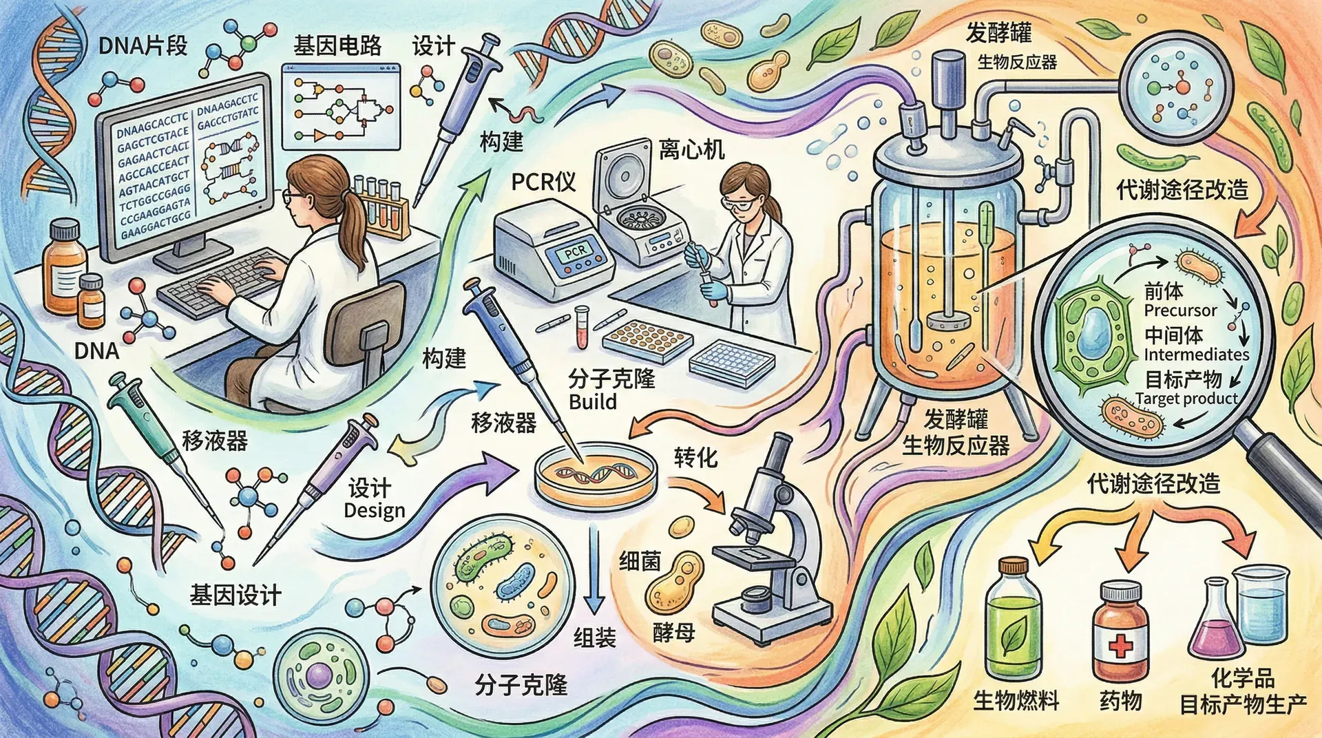 不同于传统的工艺与产业形态,现代生物技术以微生物为核心载体,将其遗传和代谢功能进行有针对性的优化与改造,从而开发出多种高附加值产品,如重组药物、功能性食品、生物燃料和绿色化学品。在推动经济高质量发展的同时,也为能源危机、环境污染、粮食安全等全球性难题提供了全新解决方案。