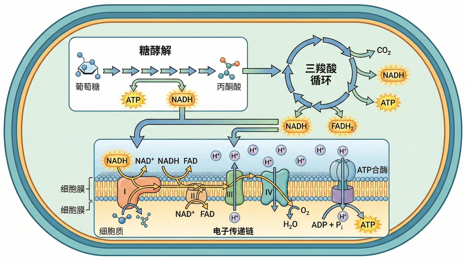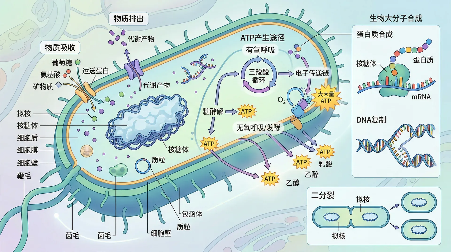 细菌获得能量主要通过呼吸作用和发酵作用,两者在ATP产量、产物和对氧气需求等方面差别显著: