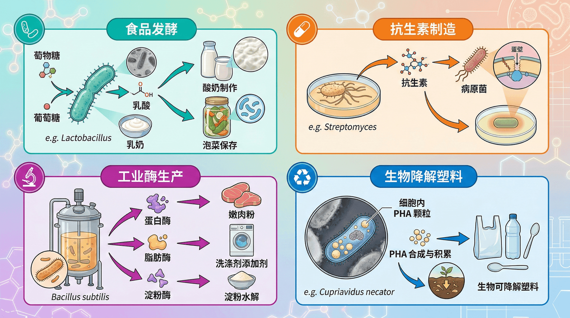 发酵作用(乳酸菌与梭菌等) 乳酸菌通过乳酸发酵产乳酸(如酸奶、泡菜),混合酸发酵则见于大肠杆菌。丁酸梭菌可产生丁酸、丁醇、丙酮,用于生物燃料或溶剂发酵——如历史上魏茨曼法制丙酮。