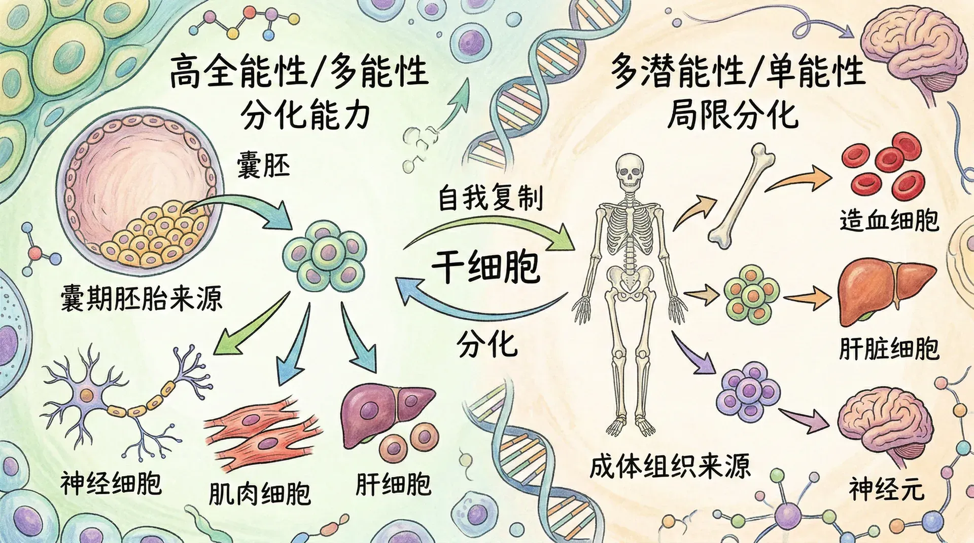 干细胞是一类具有自我更新能力和多向分化潜能的细胞。自我更新是指干细胞能够通过分裂产生与自身相同的子代细胞,维持干细胞库的稳定;多向分化潜能则是指干细胞可以分化为多种不同类型的成熟细胞。这两个特性使得干细胞在个体发育、组织修复和再生医学中具有核心地位。