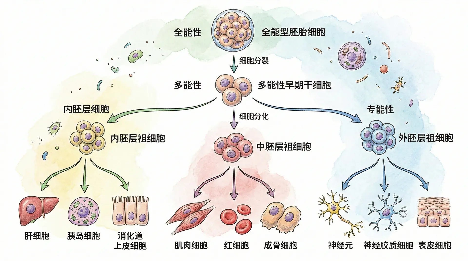 多能性,能够分化为三个胚层的所有细胞类型,包括神经细胞、心肌细胞、肝细胞等200多种细胞。