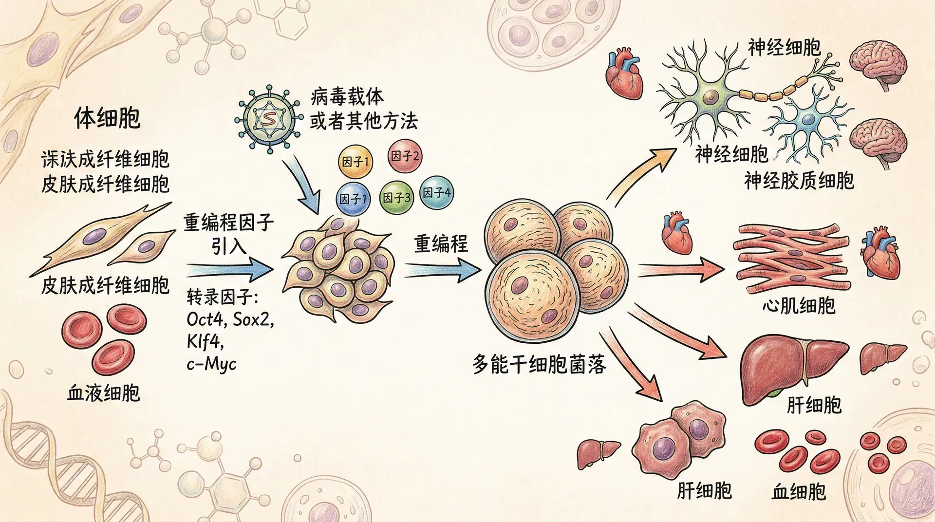 2006年,日本科学家山中伸弥团队取得了干细胞研究领域的革命性突破。他们发现通过向成熟体细胞导入四个转录因子(Oct4、Sox2、Klf4和c-Myc,简称OSKM因子),可以将其重编程为类似胚胎干细胞的多能状态,这些细胞被命名为诱导多能干细胞(iPSC)。这一成果使山中伸弥获得了2012年诺贝尔生理学或医学奖。