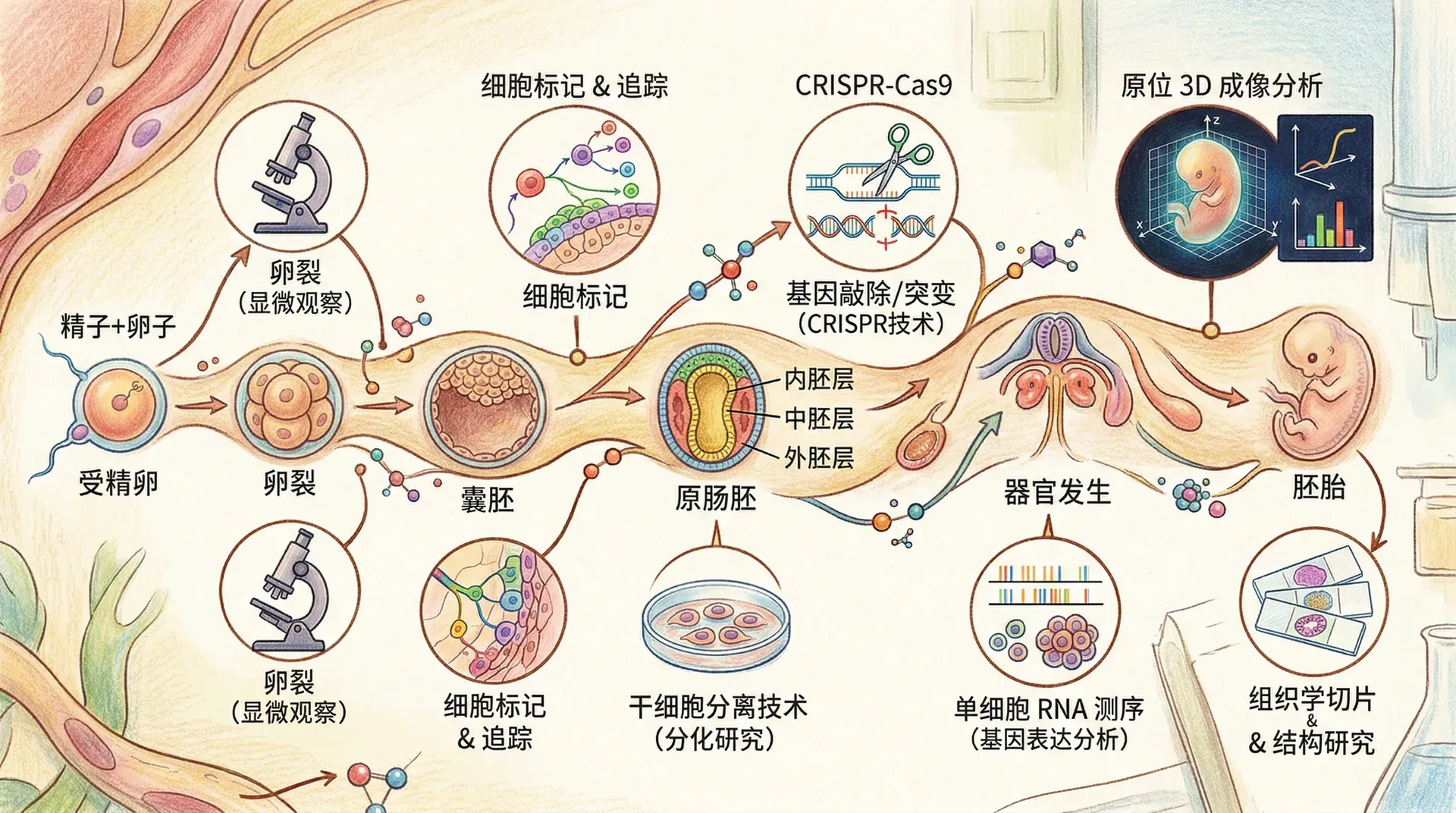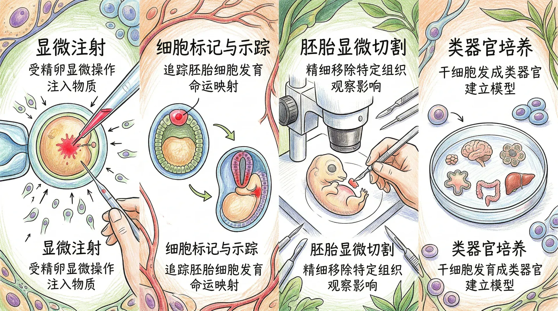 发育生物学研究方法的进步推动了学科的快速发展。早期的发育生物学研究主要依赖形态学观察和经典的胚胎操作实验,如组织移植、细胞标记等。随着分子生物学和基因组学技术的发展,现代发育生物学已经能够在单细胞、单分子水平解析发育过程。