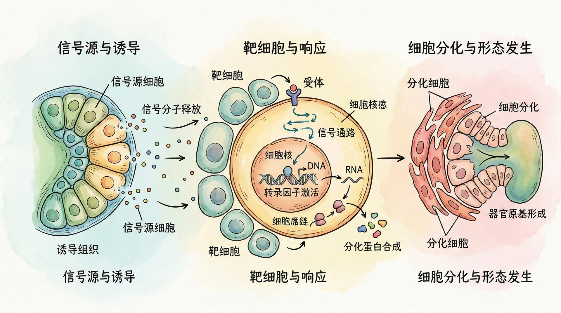 上图体现三类关键信号在发育中的梯度分布模式。正是这些信号浓度与组合的差异,使细胞能够识别自己的空间位置,激活特定基因表达,从而行使相应分化命运。