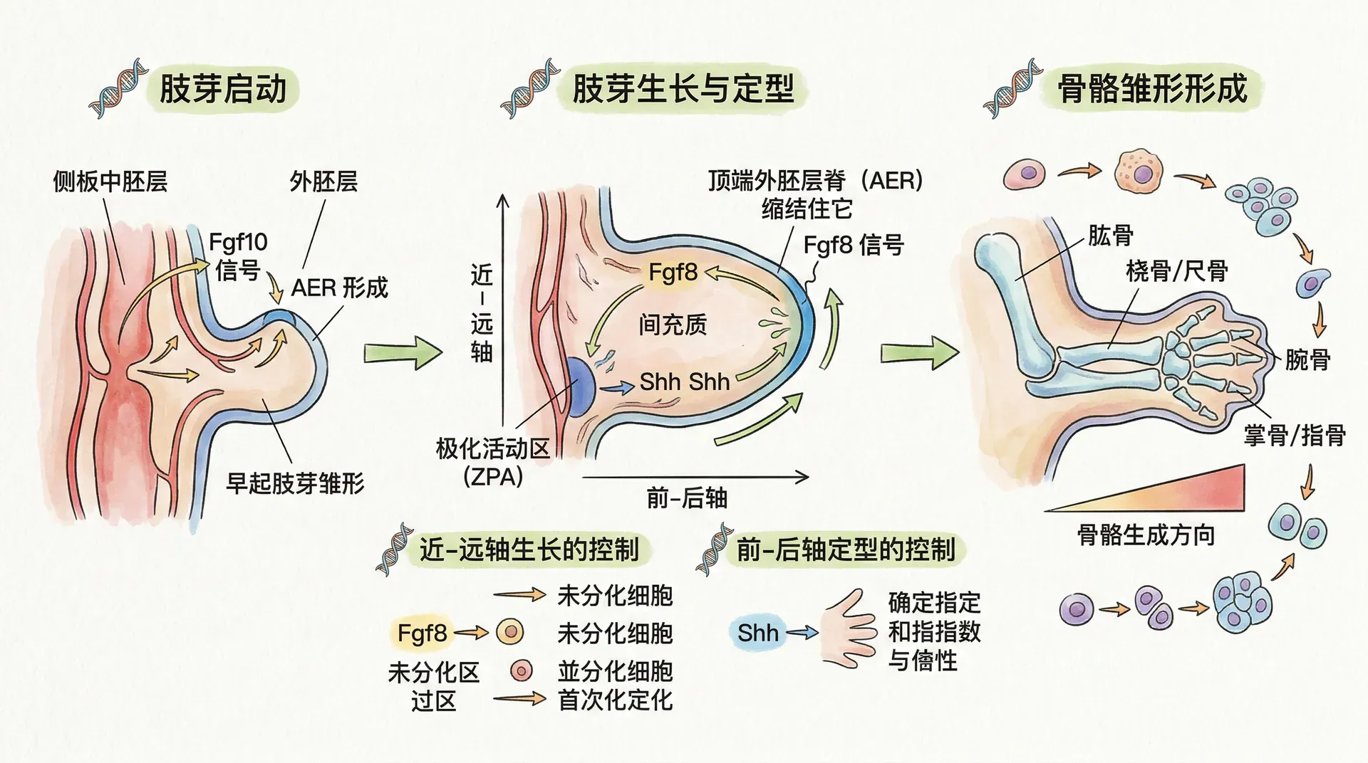 第二,与其他信号中心形成反馈调控网络。AER与位于肢芽后缘的极化活性区(ZPA)形成相互依赖的关系:ZPA分泌的Shh维持AER的FGF表达,而AER的FGF反过来维持ZPA的Shh表达。这种正反馈机制确保了肢芽生长的协调性。