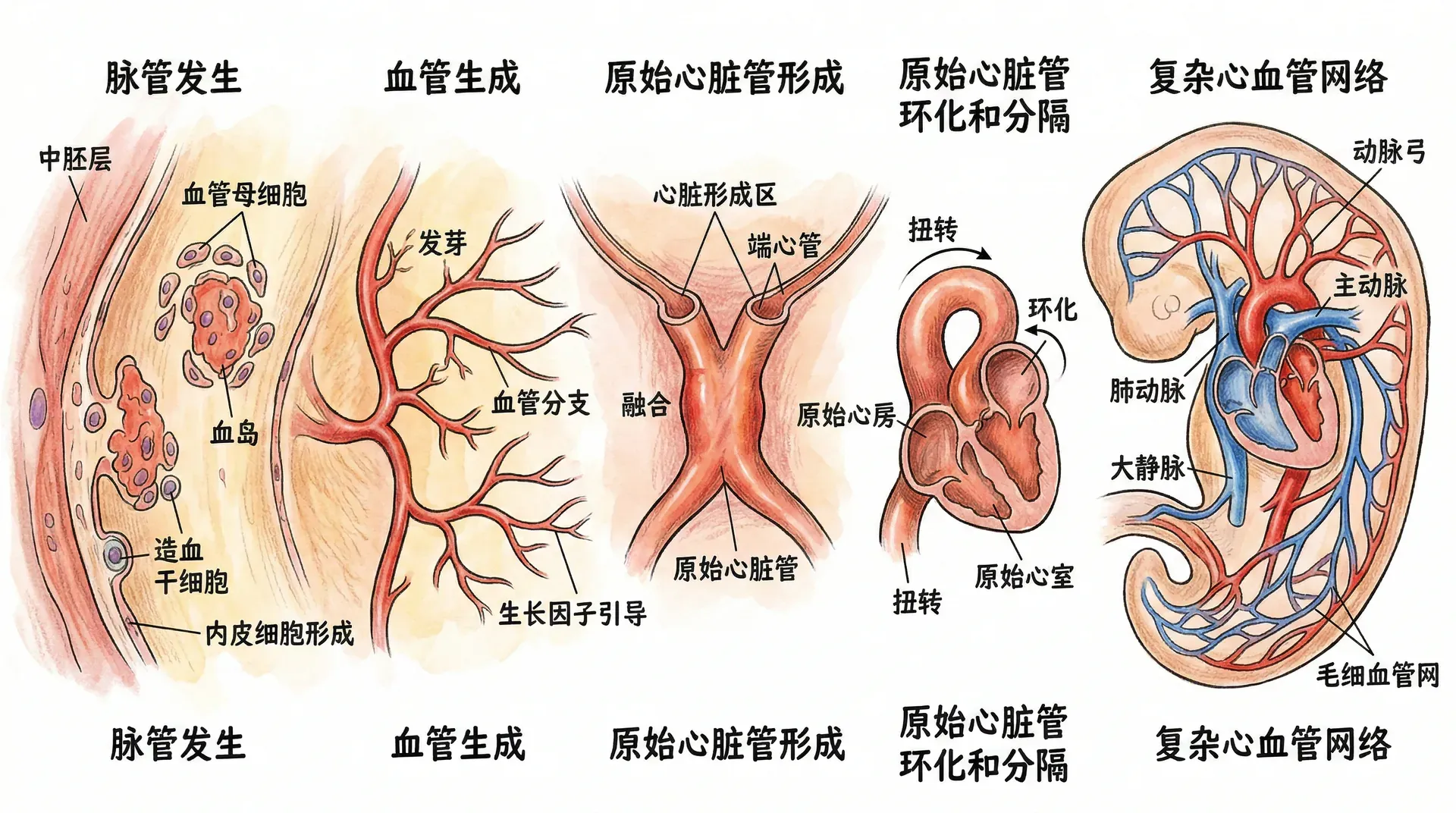 心脏起源于头端中胚层,两片弯月形心源区内卷,形成两根心内膜管。随着胚体折叠及头部抬升,心内膜管移至腹侧并融合成单一原始心管。