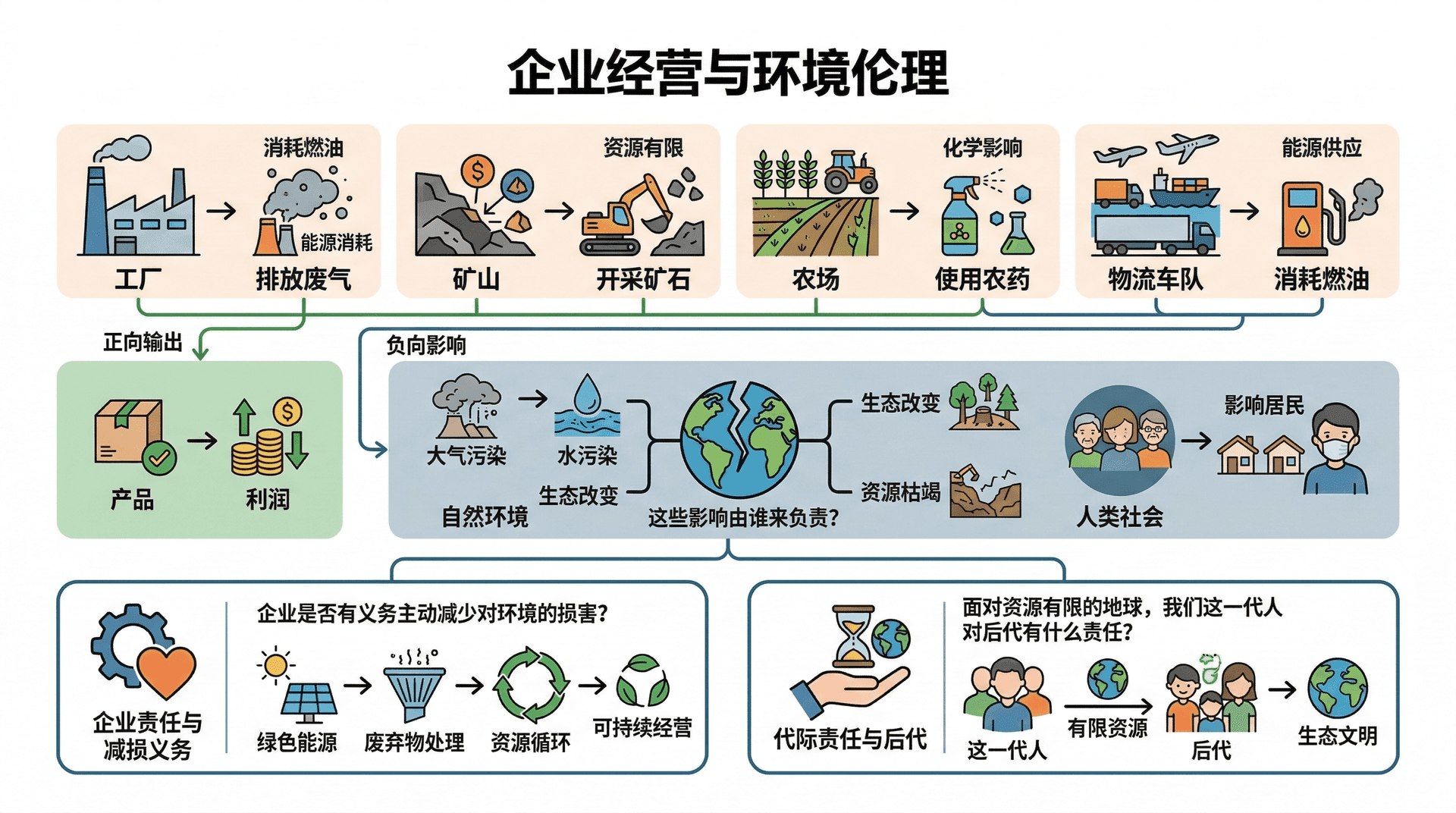 企业在经营过程中不可避免地会与自然环境发生交集:工厂排放废气、矿山开采矿石、农场使用农药、物流车队消耗燃油。这些活动创造了产品和利润,但同时也在消耗自然资源、改变生态系统、影响周围居民的生活质量。环境伦理要解决的核心问题是:这些影响由谁来负责?企业是否有义务主动减少对环境的损害?面对资源有限的地球,我们这一代人对后代有什么责任?