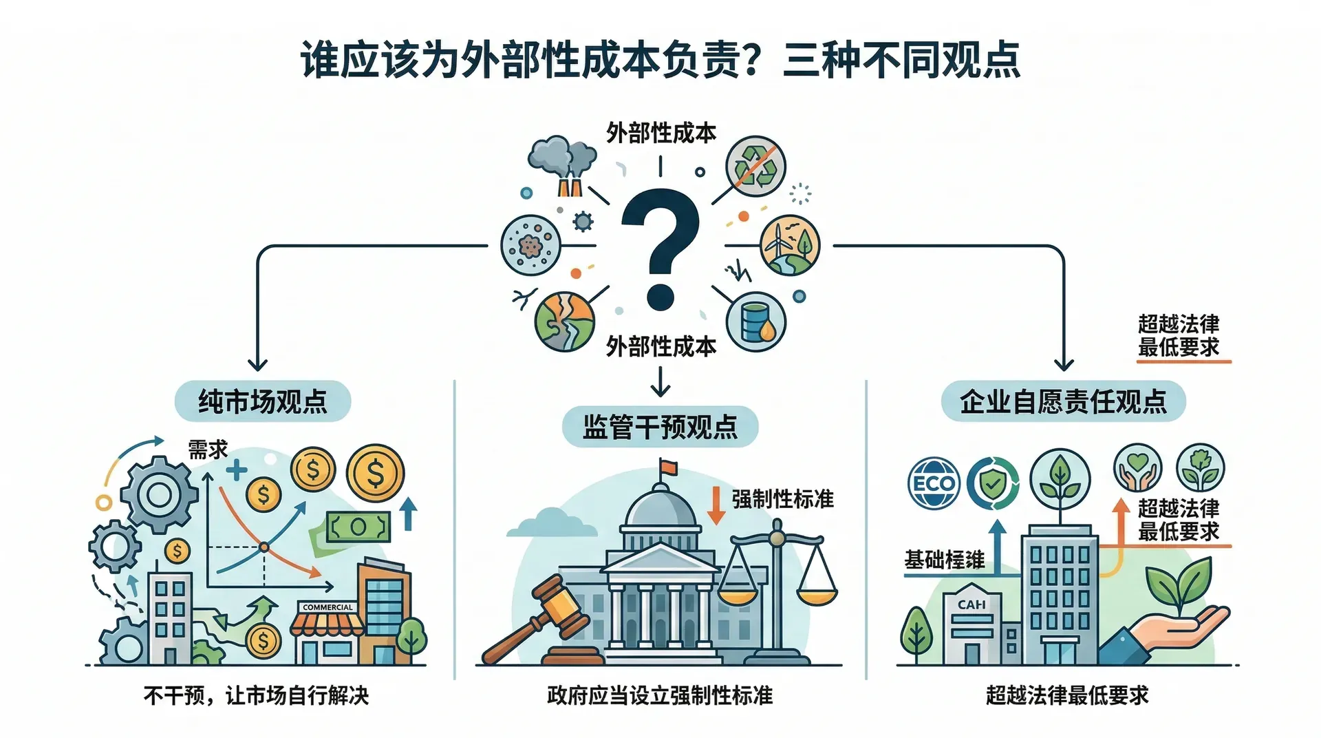 确认了外部性成本的存在之后,自然会产生一个问题:谁应该为这些成本负责?围绕这个问题,存在几种不同的观点。
