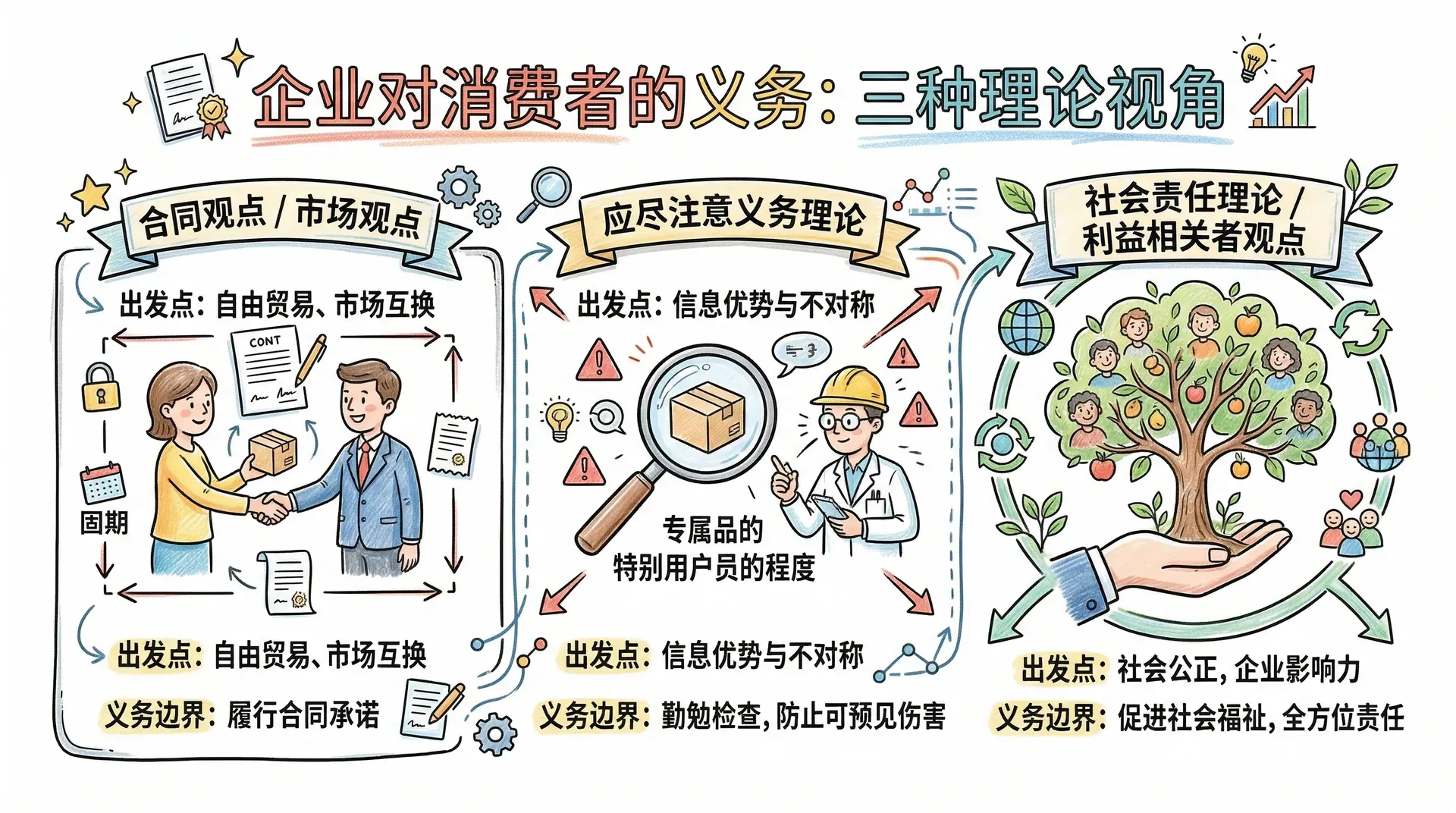 关于企业对消费者应当承担什么样的义务,学界有三种有代表性的理论视角。每种视角的出发点不同,对企业义务的划定边界也不同。