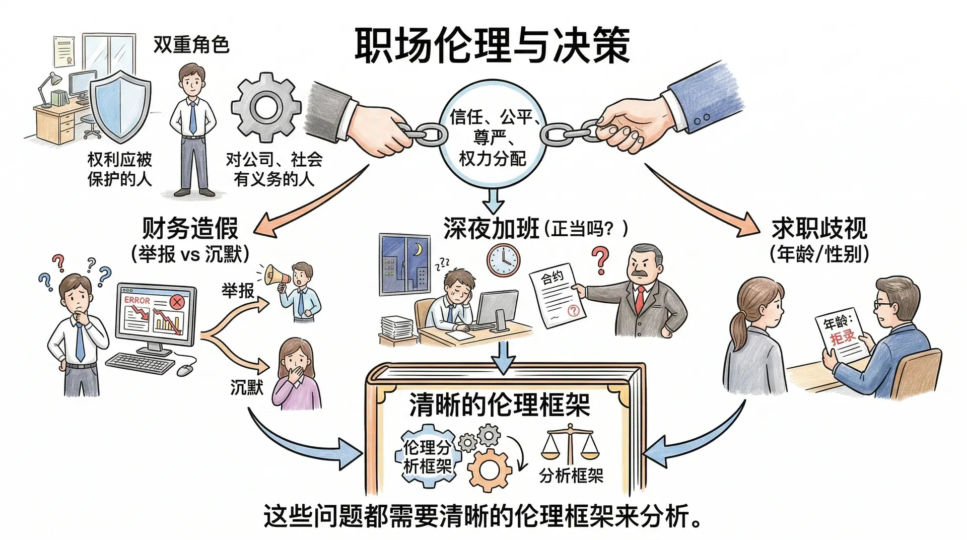 当一名员工发现公司存在财务造假时,他应该举报还是沉默?当公司要求员工在合同之外加班到深夜,这算不算正当?当一名求职者因为年龄或性别而被拒绝录用,这是否构成歧视?这些问题没有唯一的标准答案,但它们都需要一套清晰的伦理框架来分析。