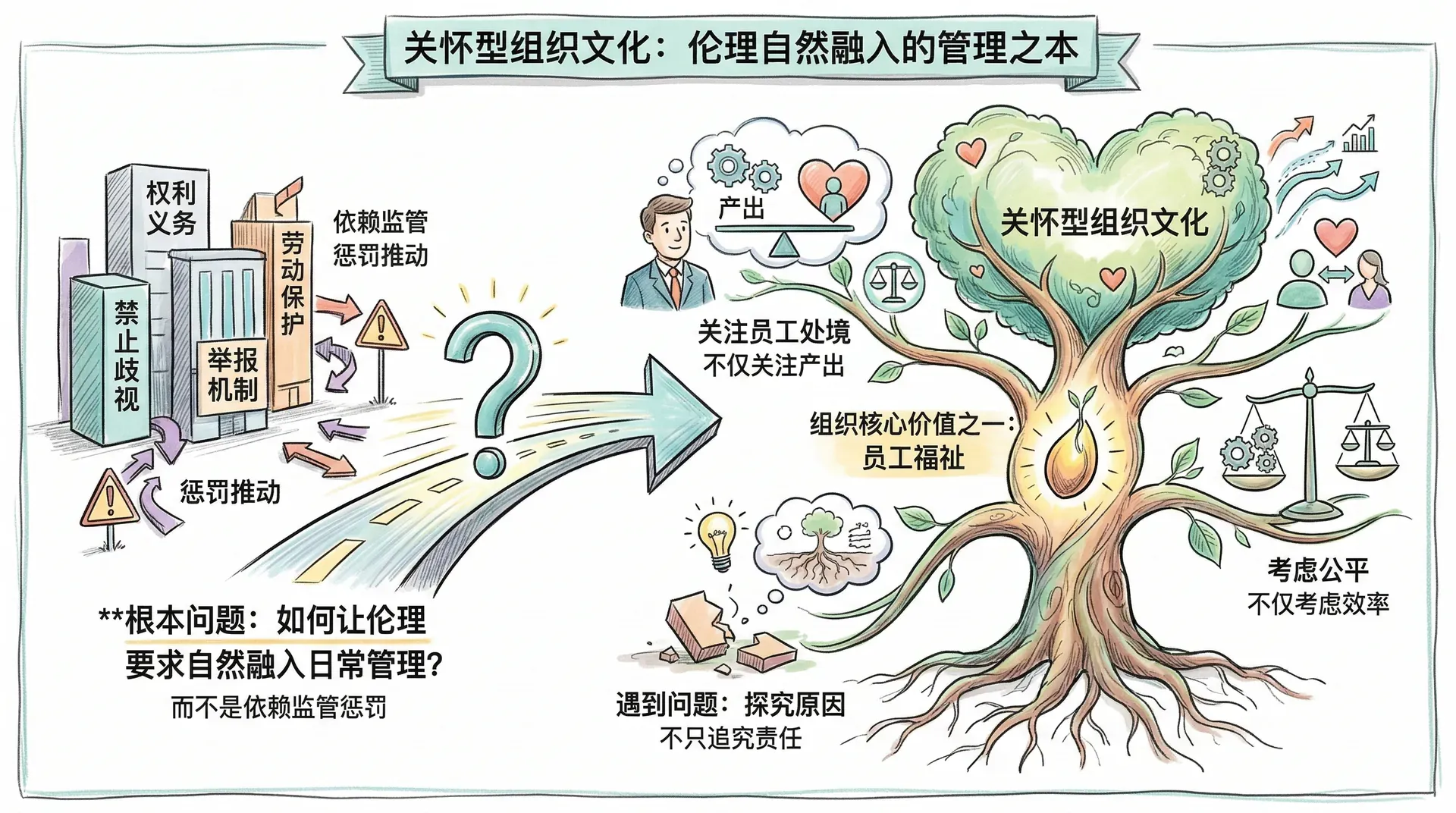 讨论了权利义务、歧视、举报和劳动保护之后,需要回答一个更根本的问题:什么样的组织文化,能够让这些伦理要求自然地融入日常管理,而不是依赖监管和惩罚来推动?