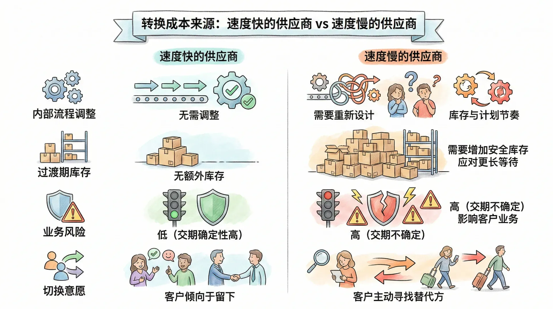 一家企业习惯了供应商的3天交货期,整个内部运营流程都围绕这个节奏设计:库存水平、生产计划、采购频率。一旦切换到一个需要7天交货期的新供应商,意味着要重新调整内部库存水平、改变采购计划频率、承担过渡期的额外库存成本。即便新供应商的价格更低,这些隐性的转换成本也会让很多客户打消念头。