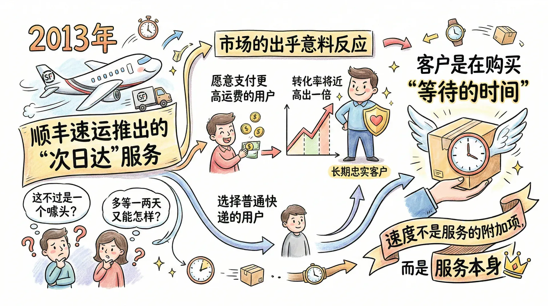 2013年,顺丰速运在全国范围内推出了"次日达"服务。当时很多人认为,这不过是一个噱头,毕竟消费者多等一两天又能怎样。但市场的反应出乎所有人意料:愿意为次日达支付更高运费的用户,比选择普通快递的用户转化为长期忠实客户的比例高出将近一倍。顺丰用这件事验证了一个在商业世界里被长期低估的规律:客户不只是在购买产品本身,他们也在购买"等待的时间"。速度,不是服务的附加项,而是服务本身。