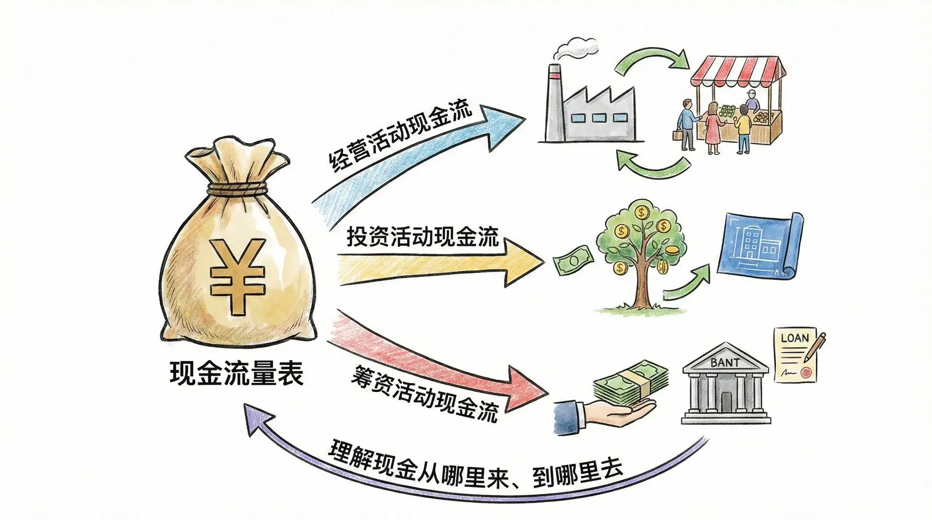 现金流量表将企业的现金流动分为三大类:经营活动现金流、投资活动现金流和筹资活动现金流。这种分类帮助我们理解现金从哪里来、到哪里去。